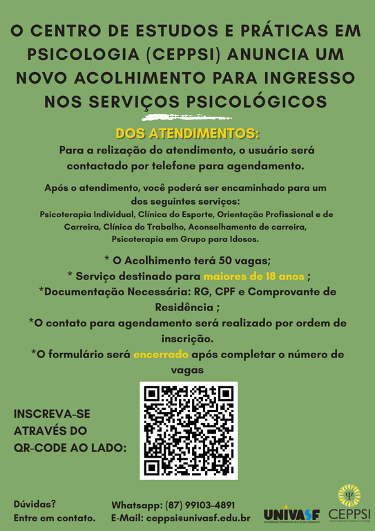 A inscrição se dará por meio do QR-CODE. O acolhimento ocorrerá presencialmente nas dependências físicas do serviço. O público-alvo são sujeitos maiores de 18 anos.