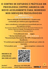 Para quem se interessa pelos serviços em Psicologia, ofertados no CEPPSI, o acolhimento é a etapa inicial. A inscrição se dará pelo preenchimento do formulário disponível no QR-CODE ou através do Link (https://forms.gle/pUzfHg61oSLM2GJ96). Nesse primeiro momento, um(a) estagiário(a) em Psicologia fará o contato via telefone para um primeiro atendimento/escuta. Após esse primeiro momento, a pessoa será contatada pelo CEPPSI para acompanhamento em serviço psicológico.