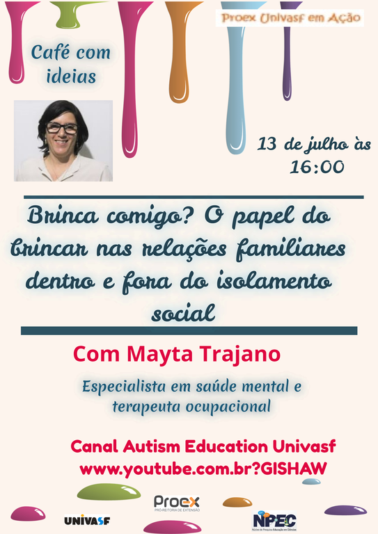 Cartaz com fundo branco com uma suave película rosa claro, traz no alto, o efeito de tinta colorida, nas cores alternadas rosa, verde, marrom, azul e vinho, escorrendo como numa pintura. No alto à esquerda, consta o nome do projeto Café com Ideias e embaixo, a foto 3x4 da convidada. No canto direito, Proex Univasf em Ação e logo embaixo a data: 13 de julho, às 16h. No centro, destaca-se o tema: “Brinca comigo? O papel do brincar nas relações familiares dentro e fora do isolamento social”, e logo abaixo o nome Mayta Trajano, especialista em saúde mental e terapeuta ocupacional. Canal Autism Education Univasf e o link https://www.youtube.com/gishaw. No final, ao centro, as logos da Proex, da Univasf e do NPEC.