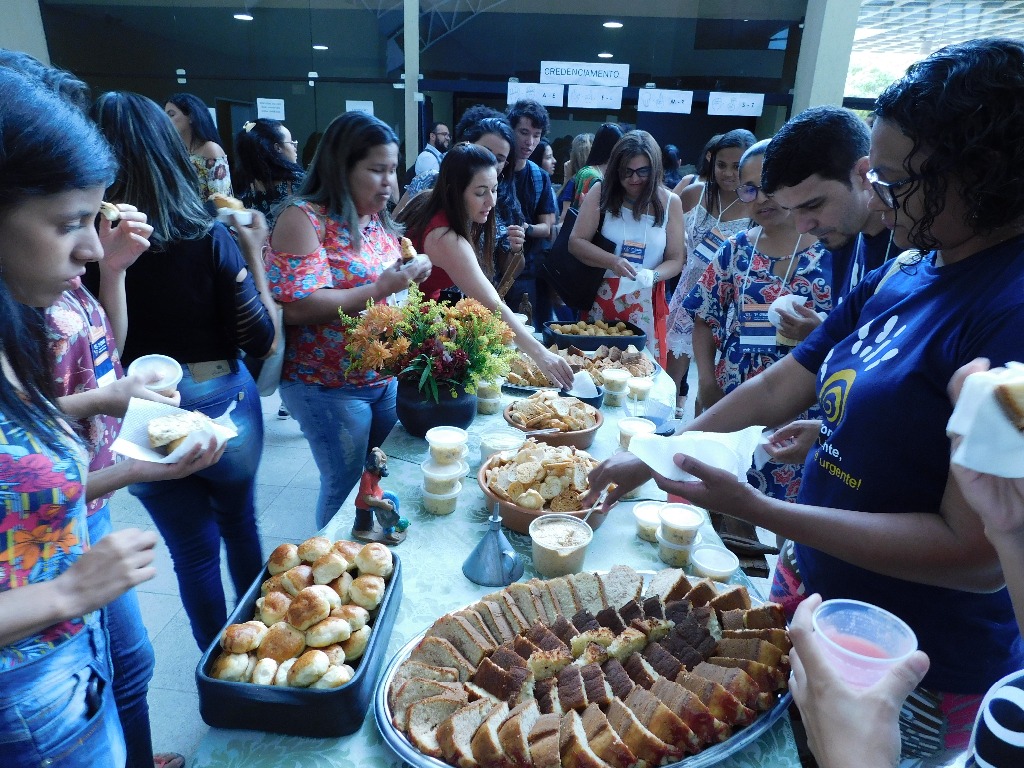 Foto docongresso, com várias pessoas ao redor de uma mesa cheia de alimentos. A mesa está repleta de pães, bolos e outros itens de buffet. Descrição da imagem fornecida com Be My Eyes.