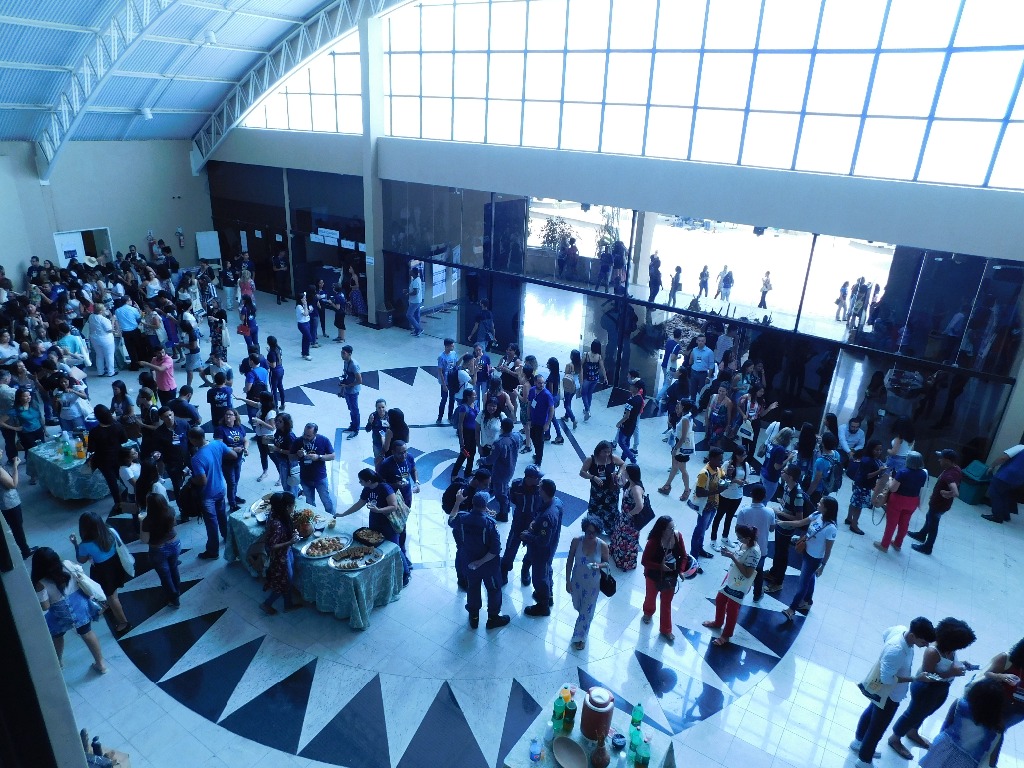 A foto, tirasa de cima, mostra uma grande quantidade de pessoas no Hall do Complexo Multieventos, um espaço amplo e iluminado, com um piso que parece ter um padrão geométrico. Descrição da imagem fornecida com Be My Eyes.