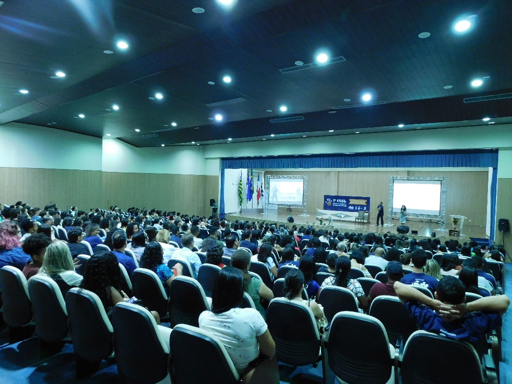 Na foto, há um auditório cheio de pessoas sentadas, todas voltadas para a frente, onde há um palco com uma apresentação em andamento. A sala está bem iluminada com luzes no teto. Descrição da imagem fornecida com Be My Eyes.