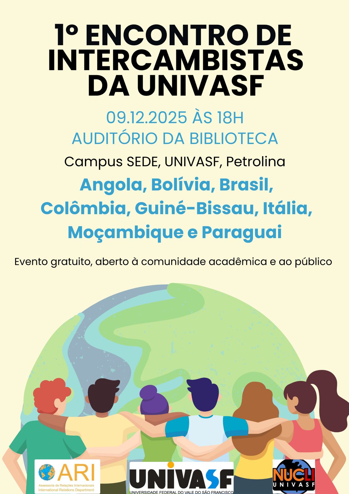 A Universidade Federal do Vale do São Francisco (Univasf), por meio da Assessoria de Relações Internacionais (ARI) e do Núcleo de Línguas (NucLi), realiza amanhã (9), às 18h, no auditório da Biblioteca do Campus Sede, em Petrolina (PE), o 1º Encontro de Intercambistas da Univasf. A iniciativa visa fortalecer a política de internacionalização da instituição e valorizar as experiências de mobilidade acadêmica vivenciadas ao longo de 2025. A expectativa é reunir cerca de 20 intercambistas oriundos de universidades de Angola, Bolívia, Brasil, Colômbia, Guiné-Bissau, Itália, Moçambique e Paraguai. O evento é gratuito e aberto à comunidade acadêmica e ao público em geral.
