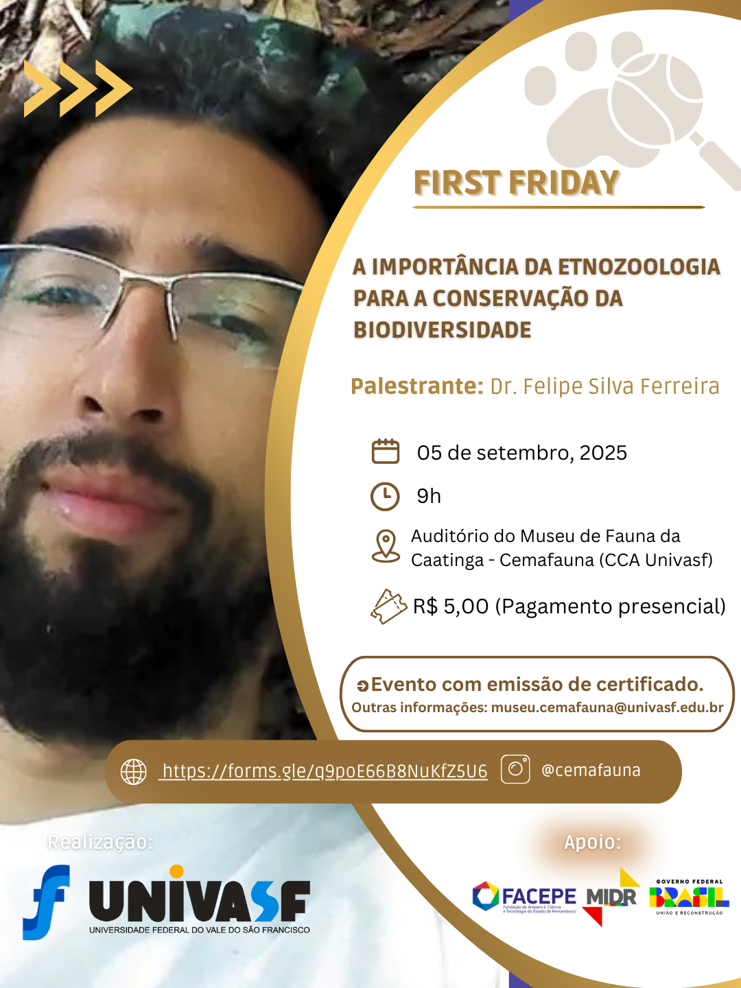 O First Friday tem se consolidado como um espaço de diálogo acessível e dinâmico sobre ciência, atraindo um público diverso, de diferentes idades e formações. A cada edição, além da palestra, os participantes têm a oportunidade de realizar um passeio pelo Museu de Fauna da Caatinga, que guarda um acervo de cerca de 60 exemplares de animais silvestres taxidermizados, todos representativos do bioma Caatinga. O espaço desperta curiosidade e possibilita uma maior conexão entre a comunidade e a biodiversidade regional. Com início às 9h, a programação tem duração mínima de uma hora e propõe uma reflexão coletiva sobre a ciência e seu papel no dia a dia. As inscrições para esta edição custam R$ 5,00, são limitadas a 70 participantes e devem ser realizadas por meio de formulário on-line https://forms.gle/kNqAMwCyTXi1fVX87 . O pagamento será efetuado no dia do evento, e ao final os inscritos receberão certificado de participação.