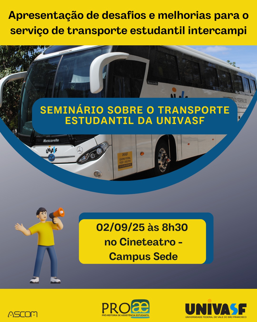 A Universidade Federal do Vale do São Francisco (Univasf) promoverá na próxima terça-feira (2) um evento para discutir o Serviço de Transporte Estudantil Intercampi, oferecido por meio da Pró-Reitoria de Assistência Estudantil (Proae). O “Seminário sobre o Transporte Estudantil da Univasf” será realizado no Cineteatro, no Campus Sede, em Petrolina (PE), a partir das 8h30, e é aberto a toda a comunidade. Haverá transmissão ao vivo pelo canal da TV Caatinga no YouTube.
