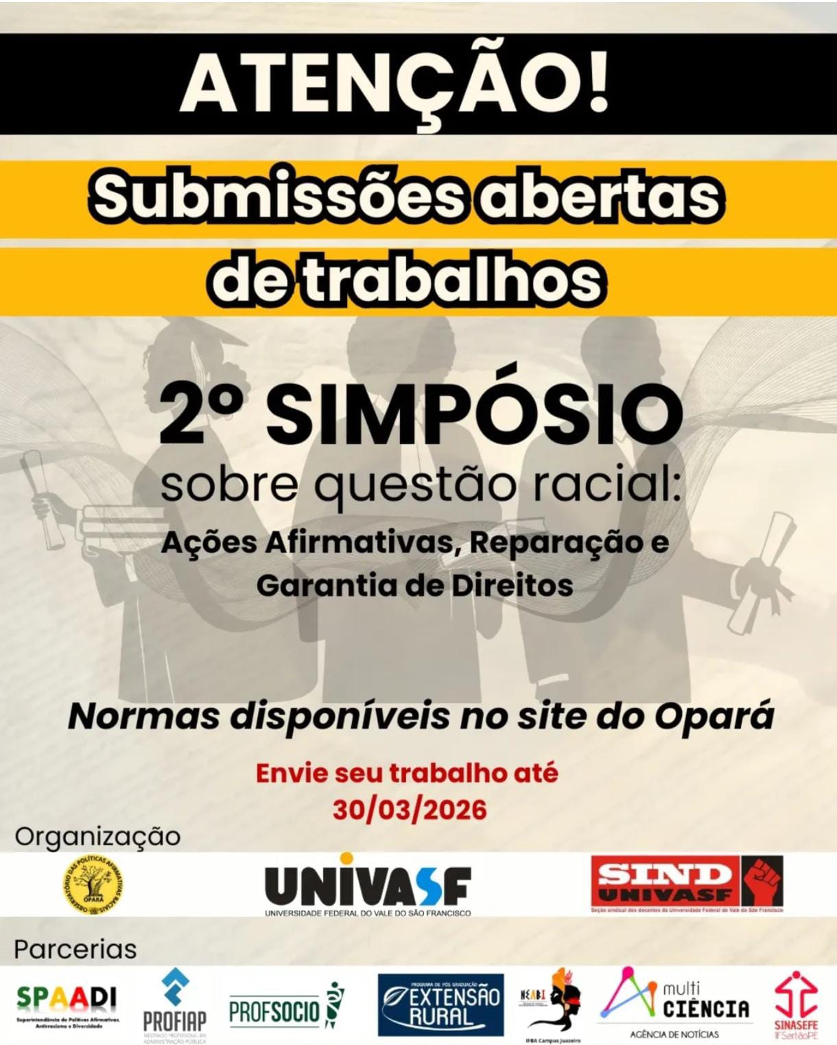 Estão abertas as inscrições para o 2º Simpósio sobre Questão Racial, evento promovido pelo Observatório Opará da Universidade Federal do Vale do São Francisco (Univasf) e pela Seção Sindical dos Docentes da Univasf (Sindunivasf). Com o tema “Ações Afirmativas, Reparação e Garantia de Direitos”, o simpósio busca fomentar o debate sobre o racismo no Brasil, com foco nas políticas públicas de igualdade racial nos âmbitos nacional, estadual e municipal. O evento acontecerá de 13 a 15 de maio de 2026, no Complexo Multieventos do Campus Juazeiro, e as inscrições permanecem abertas até o dia do evento.