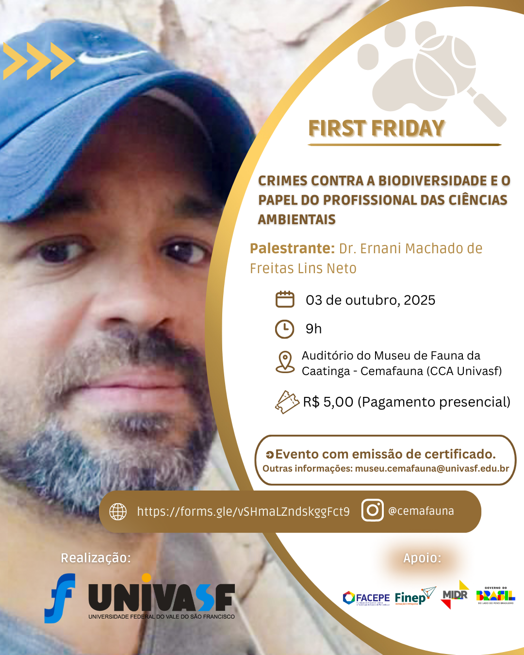 O Centro de Conservação e Manejo de Fauna da Caatinga (Cemafauna/Univasf) realiza, no próximo dia 03 de outubro, a quarta edição do First Friday 2025. O encontro traz como tema “Crimes contra a biodiversidade e o papel do profissional das ciências ambientais”, a ser ministrado pelo professor Ernani Machado de Freitas Lins Neto.