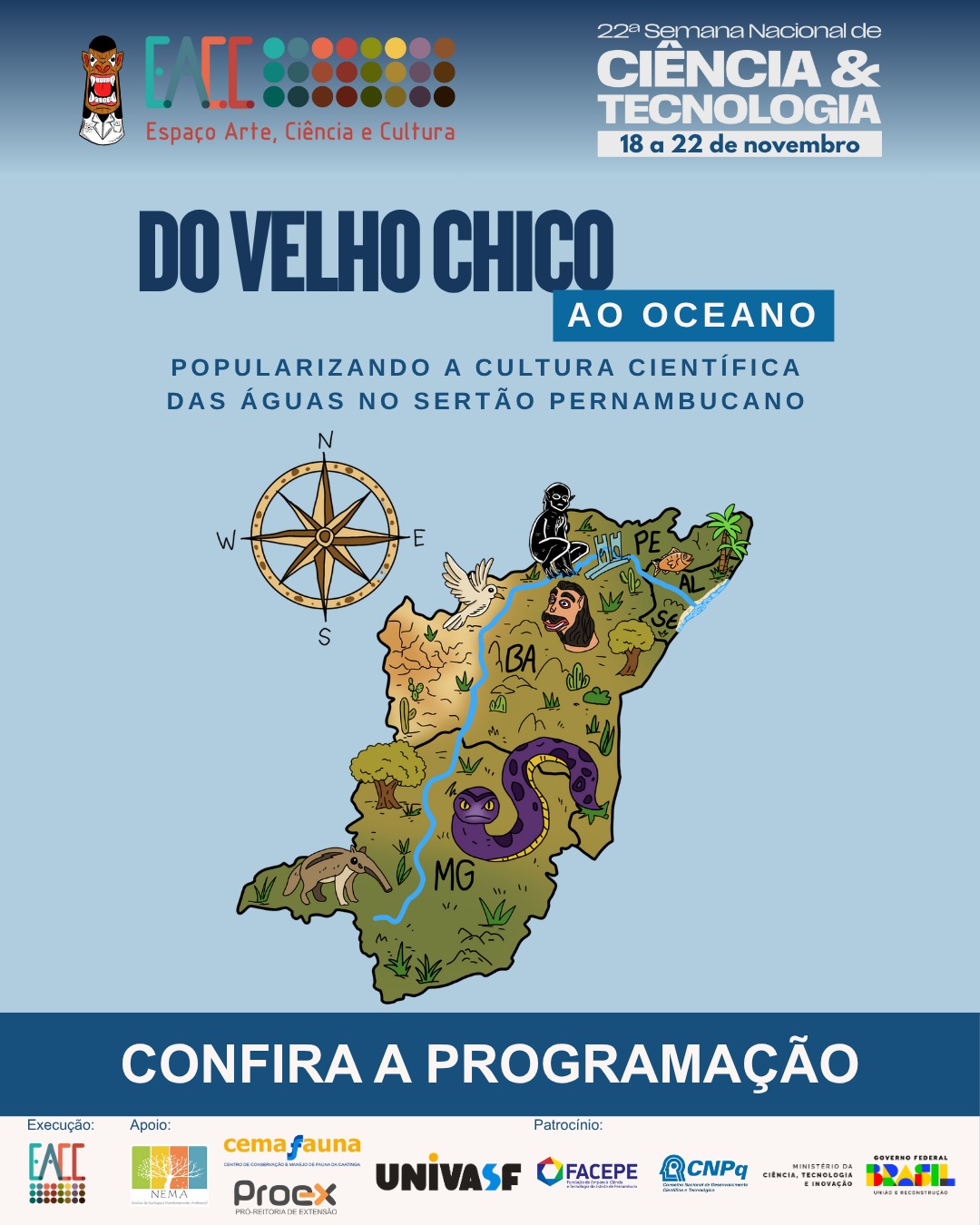 “Ao valorizar o Velho Chico como elo entre o Sertão e o oceano, o evento busca ampliar a consciência sobre a responsabilidade compartilhada na conservação dos recursos hídricos e na construção de uma cultura científica mais inclusiva e territorializada”, destaca a professora do Colegiado de Ciências Biológicas e diretora do EACC, Patrícia Nicola, sobre o evento. A programação detalhada e outras informações podem ser obtidas no site e no Instagram do EACC.
