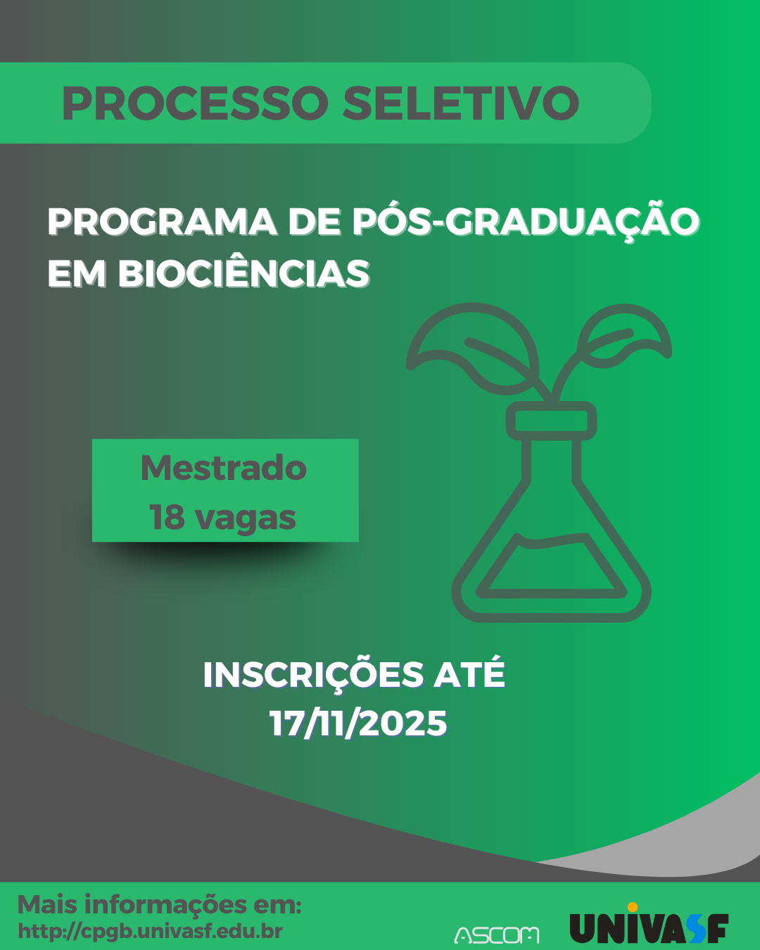 A Universidade Federal do Vale do São Francisco (Univasf) está com inscrições abertas para o processo seletivo do Programa de Pós-Graduação em Biociências (PPGB), em nível de mestrado, com ingresso previsto para o período letivo 2026.1. O edital disponibiliza 18 vagas, distribuídas entre as áreas específicas do programa, conforme a disponibilidade de orientação dos docentes.