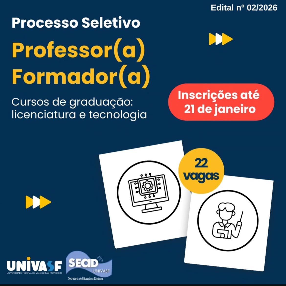 A Secretaria de Educação a Distância (SEaD) da Universidade Federal do Vale do São Francisco (Univasf) divulgou a abertura das inscrições para o processo seletivo de professor formador, em caráter temporário. Estão sendo ofertadas 22 vagas para atuação como bolsista da Coordenação de Aperfeiçoamento de Pessoal de Nível Superior (Capes), no âmbito do Sistema Universidade Aberta do Brasil (UAB), em cinco cursos na modalidade de educação a distância (EaD). As inscrições são gratuitas e seguem abertas até o dia 21 de janeiro.