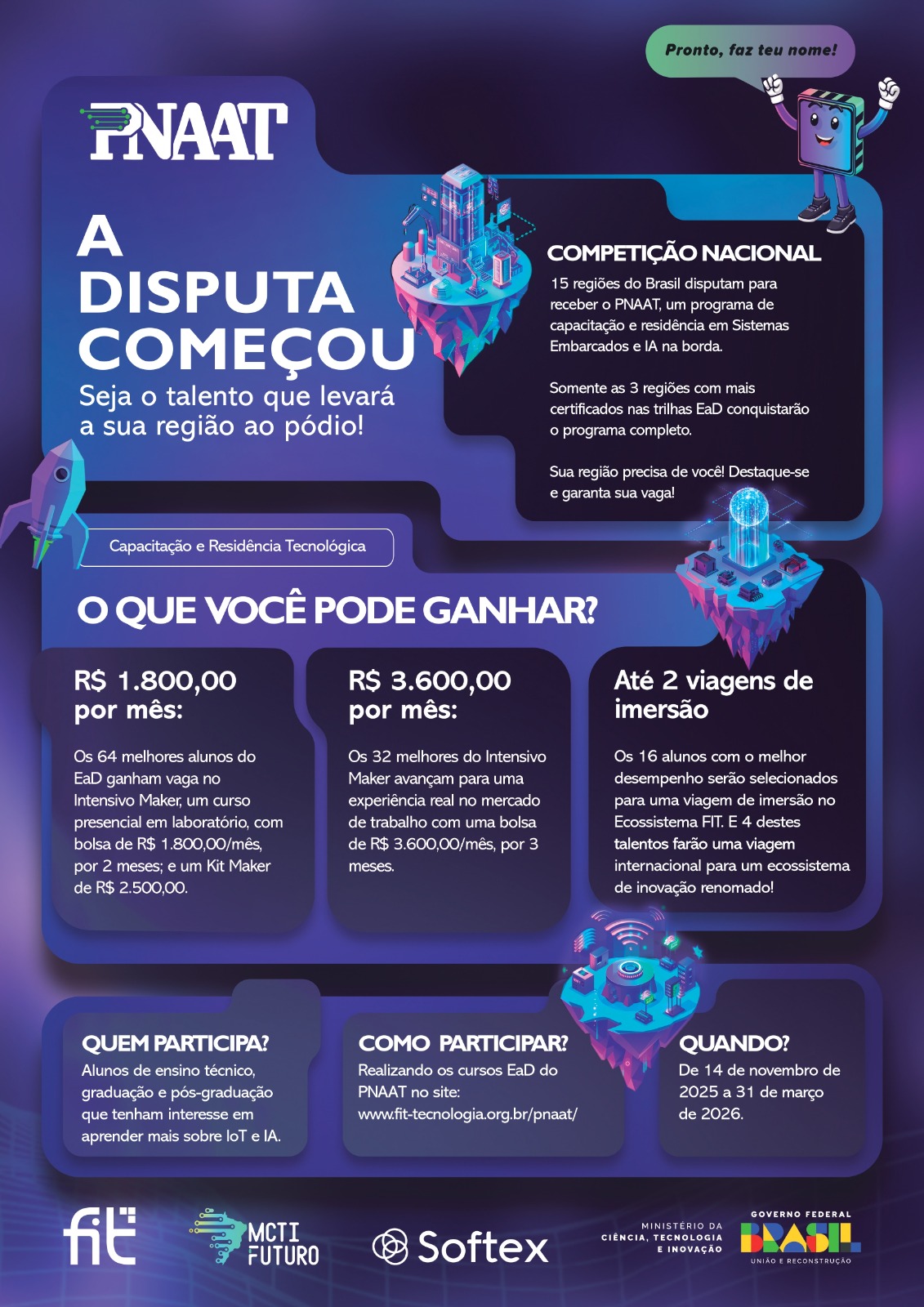 Estudantes da Universidade Federal do Vale do São Francisco (Univasf) interessados em ampliar seus conhecimentos na área de tecnologia podem se inscrever gratuitamente nas formações do Programa Nacional de Aprendizado Acelerado em Tecnologia (PNAAT), que entra agora em sua fase competitiva. A etapa promove uma disputa entre 15 regiões brasileiras, e as três com maior mobilização de estudantes e empresas receberão laboratórios de última geração e participarão do ciclo completo de residência tecnológica. As inscrições estão abertas para cursos na modalidade a distância (EaD) nas áreas de hardware, Internet das Coisas (IoT) e Inteligência Artificial aplicada localmente em dispositivos (IA na borda). A iniciativa é realizada pelo FIT – Instituto de Tecnologia, em parceria com a Softex e o Ministério da Ciência, Tecnologia e Inovação (MCTI), e prevê ainda bolsas de até R$ 3.600 durante a fase prática do programa.