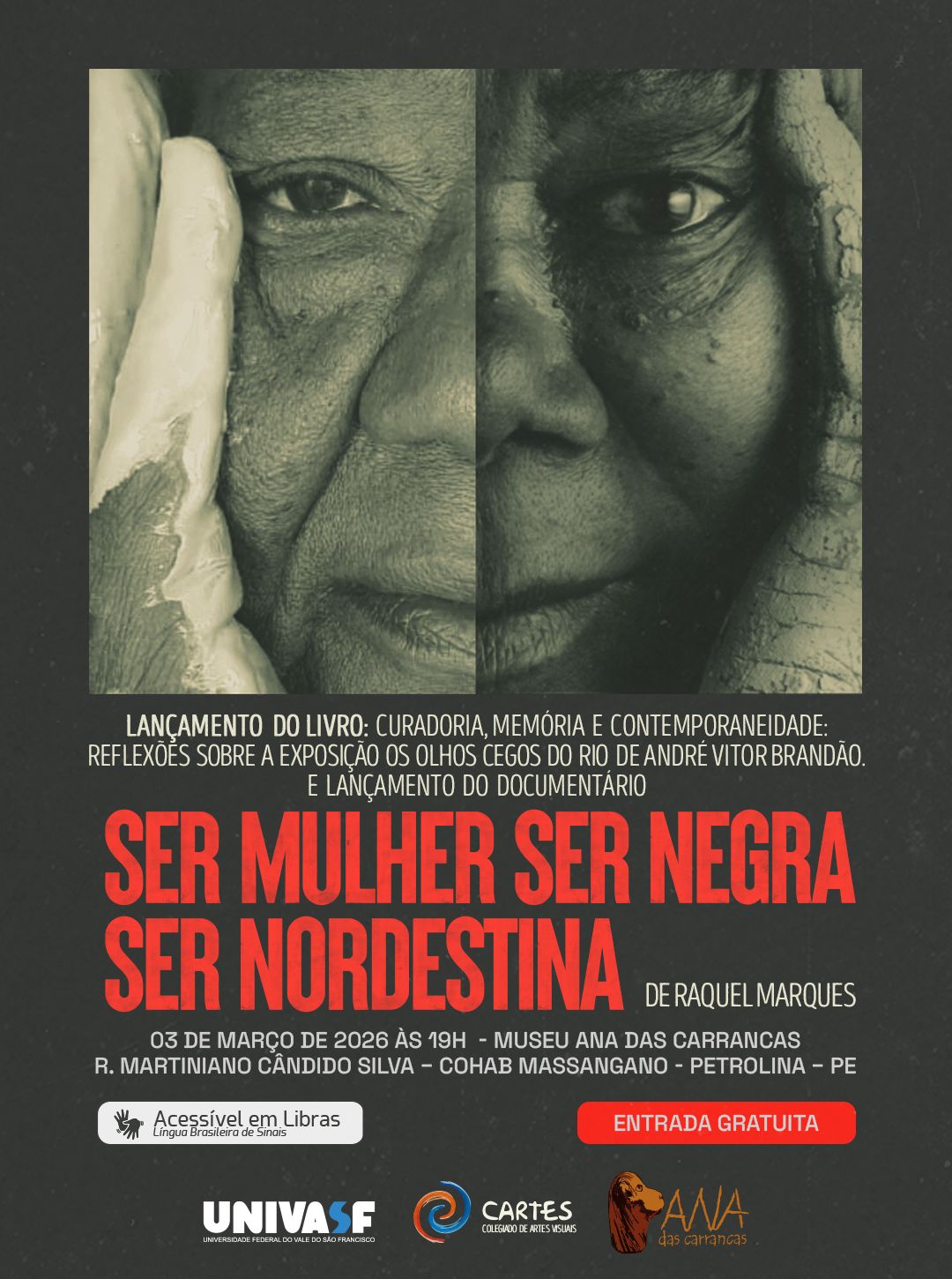 Foi alterado o local de realização do evento de lançamento do documentário “Ser Mulher, Ser Negra, Ser Nordestina” e do livro “Curadoria, memória e contemporaneidade: reflexões sobre a exposição Os Olhos Cegos do Rio” sobre Ana das Carrancas. Promovido pelo Colegiado de Artes Visuais da Universidade Federal do Vale do São Francisco (Univasf), o evento ocorrerá nesta terça-feira (3), na sala Multiuso do Sesc Petrolina, localizado à R. Pacífico da Luz, 618, Centro, com início às 19h, conforme previsto. O evento faz parte da Semana de Integração do curso de Artes Visuais e é aberto a toda a comunidade. Mais informações sobre a ação estão disponíveis neste link.