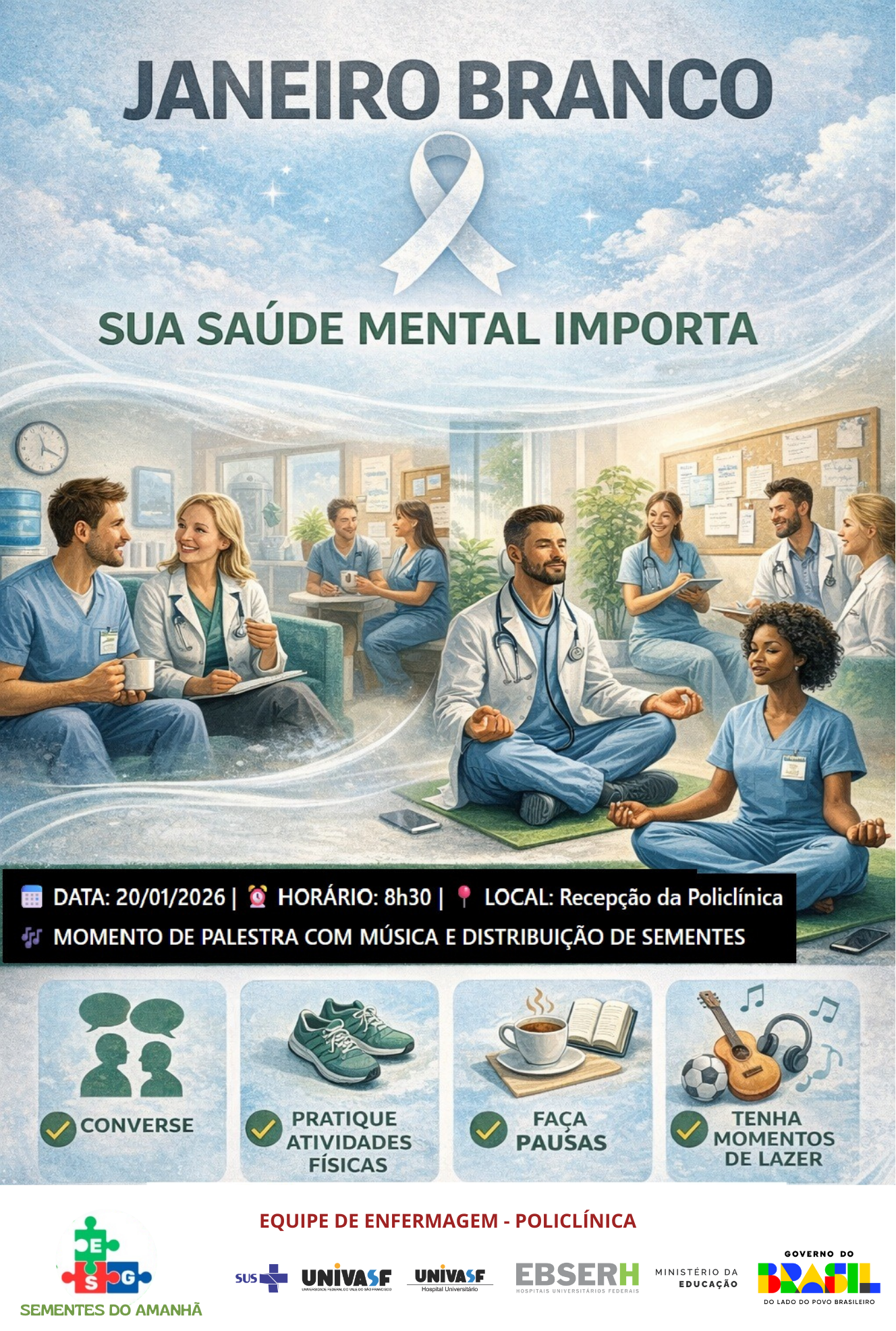 O ano começa com a campanha Janeiro Branco, destinada a conscientizar sobre a necessidade de colocar a saúde mental como prioridade e considerar o cuidado com a mente como um compromisso coletivo. O assunto é destaque este mês no Hospital Universitário da Universidade Federal do Vale do São Francisco (HU-Univasf), que promove um momento de acolhimento junto a pacientes, acompanhantes, profissionais e estudantes, com palestra educativa, apresentação musical e distribuição de sementes para plantio. O HU-Univasf é vinculado à Empresa Brasileira de Serviços Hospitalares (Ebserh).