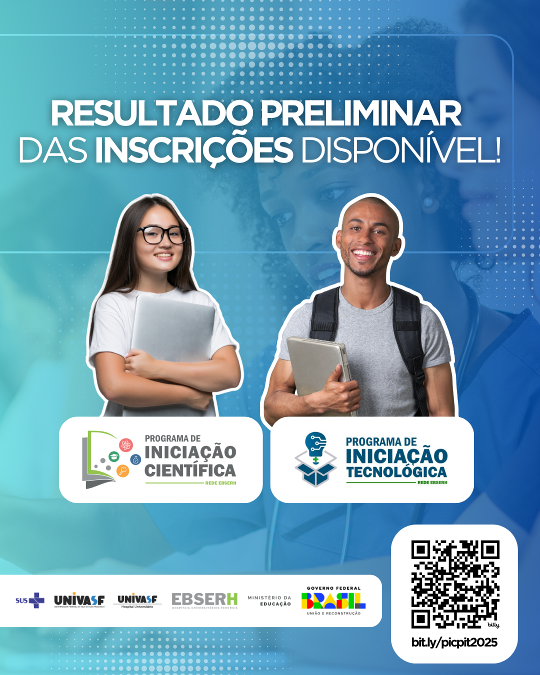O Setor de Gestão da Pesquisa e Inovação Tecnológica em Saúde (SGPITS) do Hospital Universitário da Universidade Federal do Vale do São Francisco (HU-Univasf) divulgou hoje (9) o resultado preliminar das inscrições para o Programa de Iniciação Científica (PIC) e para o Programa de Iniciação Tecnológica (PIT) da Empresa Brasileira de Serviços Hospitalares (Ebserh). A iniciativa é realizada em parceria com o Conselho Nacional de Desenvolvimento Científico e Tecnológico (CNPq).