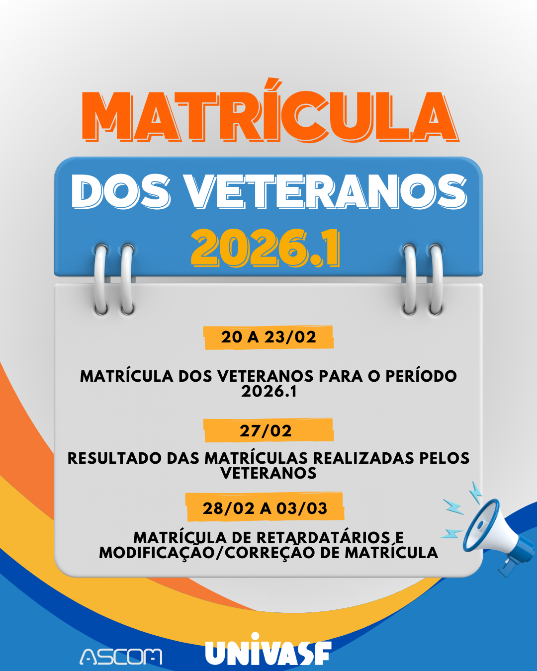 Os estudantes veteranos dos cursos de graduação presenciais da Universidade Federal do Vale do São Francisco (Univasf) devem realizar a matrícula no período letivo 2026.1 a partir desta sexta-feira (20). O procedimento deve ser efetuado pelos discentes até segunda-feira (23), exclusivamente pelo Sistema de Informações e Gestão Acadêmica (Sig@).