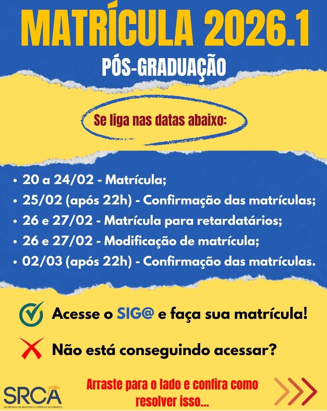 A matrícula dos estudantes veteranos dos cursos de pós-graduação da Universidade Federal do Vale do São Francisco (Univasf) para o período letivo 2026.1 acontece até terça-feira (24). Devem se matricular todos os estudantes dos cursos de especialização, mestrado e doutorado, ofertados nas modalidades presencial e a distância. O procedimento deve ser efetuado pelos discentes exclusivamente pelo Sistema de Informações e Gestão Acadêmica (Sig@).