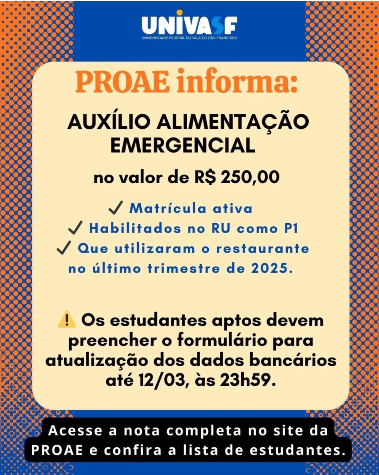 A Pró-Reitoria de Assistência Estudantil (Proae), no uso de suas atribuições legais e considerando a deliberação e aprovação da Câmara de Assistência Estudantil, em reunião ordinária realizada em 10 de março de 2026, comunica que será disponibilizado o Auxílio Alimentação Emergencial, no valor de R$ 250,00 (duzentos e cinquenta reais).