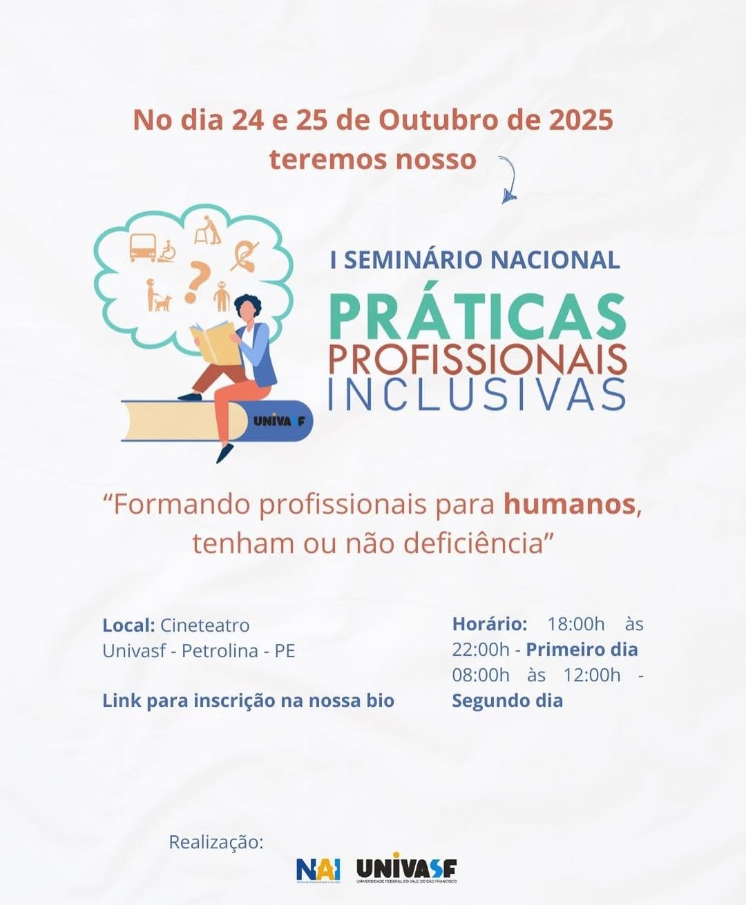 Será realizada hoje (24) a abertura do I Seminário Nacional Práticas Profissionais Inclusivas, promovido pelo Núcleo de Acessibilidade e Inclusão (NAI) da Universidade Federal do Vale do São Francisco (Univasf). O evento, que irá até amanhã (25), tem como destaque o lançamento oficial do Programa Institucional Práticas Profissionais Inclusivas (PPI). O Programa tem como objetivo formar profissionais inclusivos, buscando também garantir a inserção de pessoas com deficiência no mercado de trabalho. A solenidade acontece a partir das 18h, no Cineteatro do Campus Sede, em Petrolina (PE), e será transmitida pelo canal da TV Caatinga no YouTube.