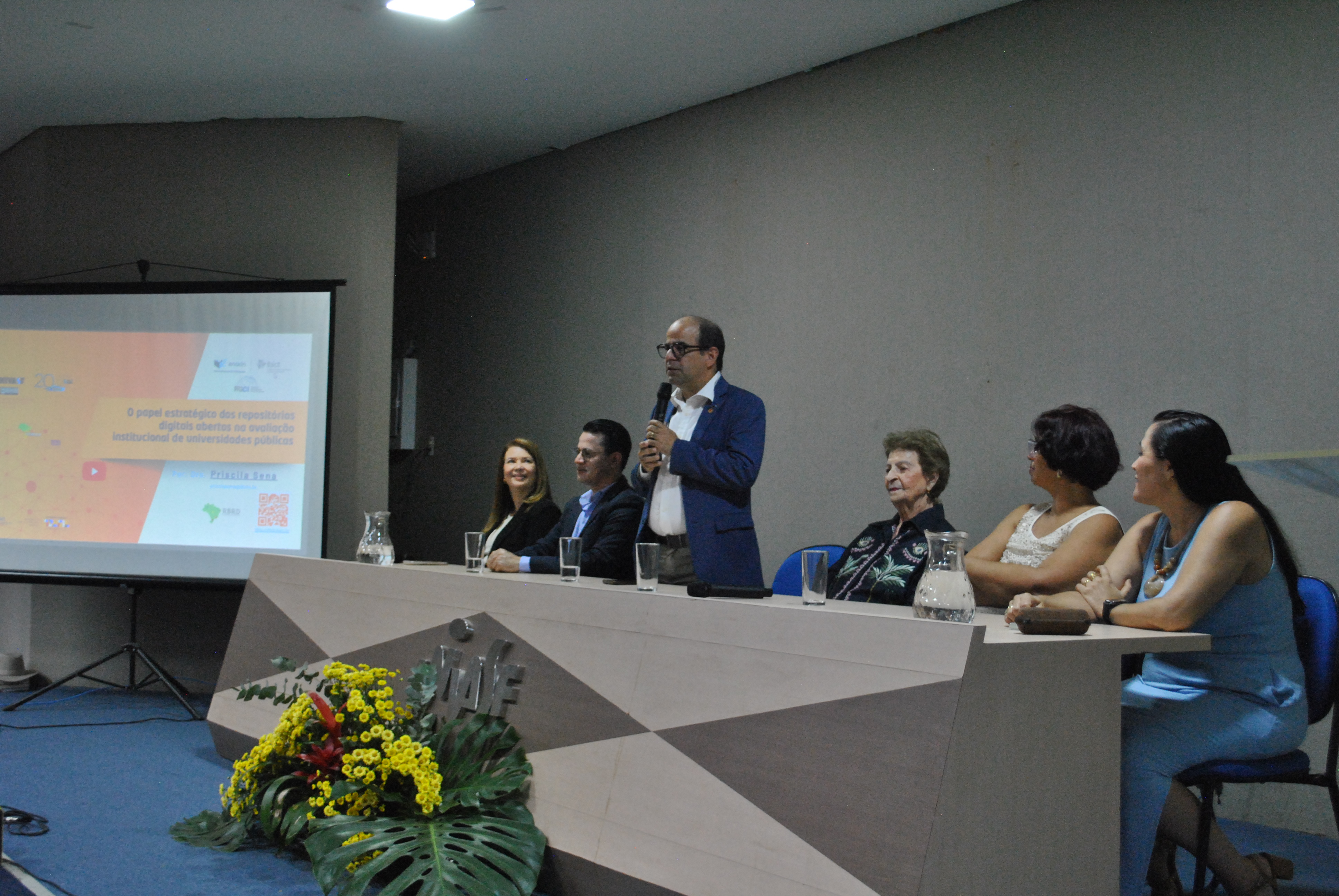 O evento foi aberto oficialmente pelo reitor Telio Nobre Leite, durante mesa composta também pela vice-reitora Lucia Marisy de Oliveira; pela pró-reitora de Pesquisa, Pós-Graduação e Inovação, Helena Matos; pela pró-reitora de Extensão, Michelle Christini Vieira; pela diretora de Desenvolvimento e Inovação Acadêmica, Virgínia Passos; e pelo diretor do Sistema Integrado de Bibliotecas (Sibi), Lucídio Lopes de Alencar.