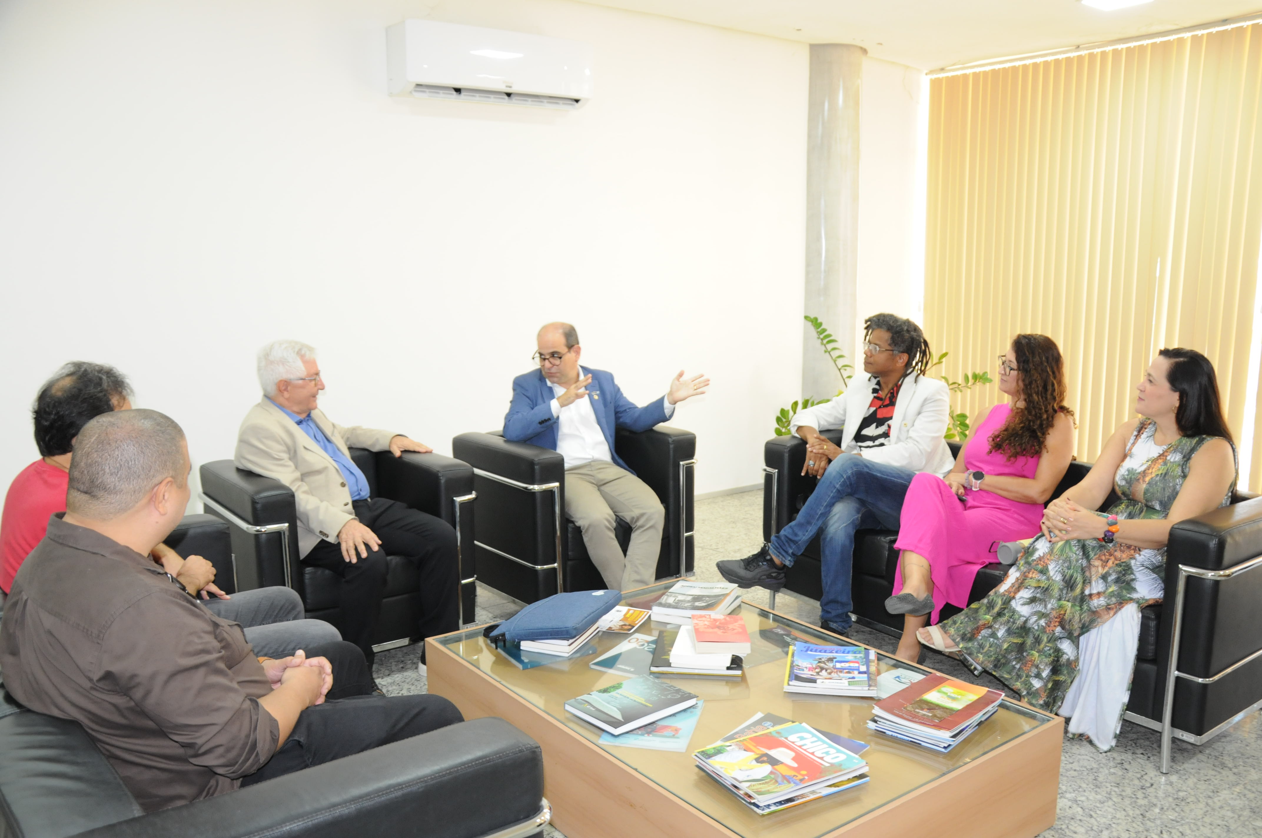 O reitor Telio Leite recebeu na quarta-feira (18), no Gabinete da Reitoria, o presidente do CNPq, Olival Freire Junior. O encontro também contou com a presença da pró-reitora de Pesquisa, Pós-Graduação e Inovação, Helena Matos; do diretor superintendente de Políticas Afirmativas, Antirracismo e Diversidade, Nilton de Almeida; do diretor de Pós-Graduação, Daniel Menezes; da diretora de Programas Especiais de Graduação, Sued Sheila Sarmento; do coordenador do PPGENS, Albano Goes; e do coordenador do Colegiado de História do Campus Senhor do Bonfim, José Eduardo Clemente. Durante a reunião na Reitoria, Olival Freire Junior apresentou iniciativas e editais destinados ao incentivo da pesquisa e da inovação.