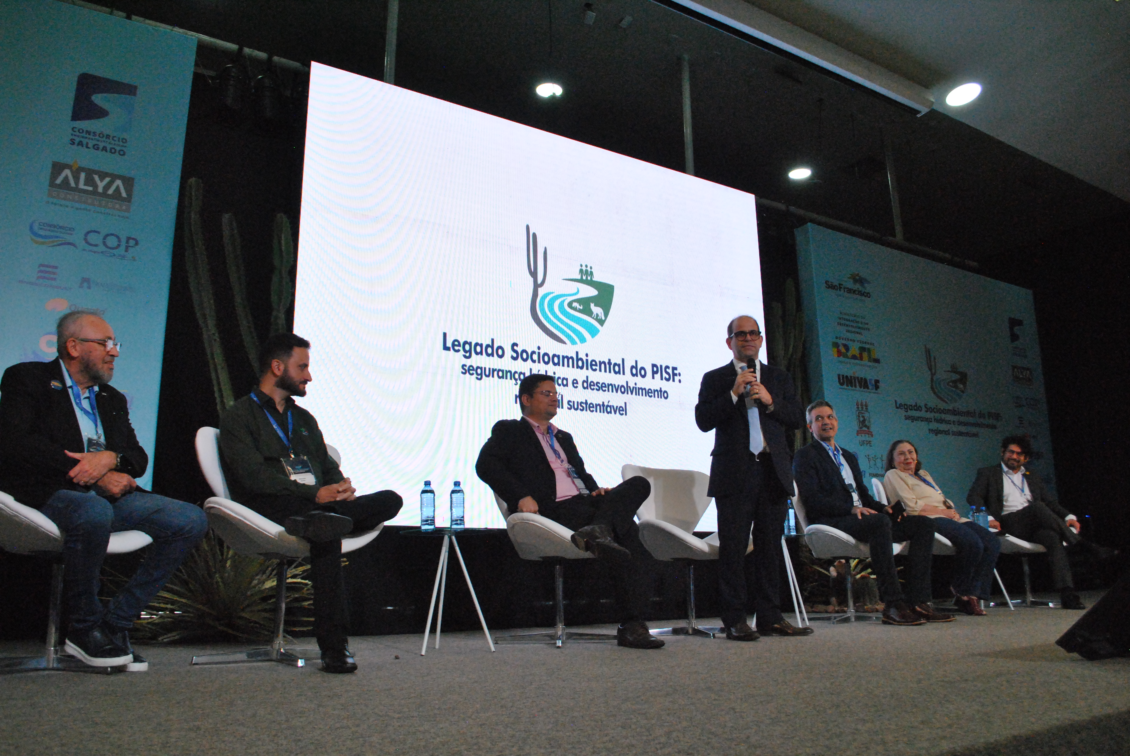 Na quarta-feira (13), o reitor telio Nobre Leite participou da solenidade de abertura do evento “Legado Socioambiental do PISF: Segurança Hídrica e Desenvolvimento Regional Sustentável”, realizado pelo Ministério da Integração e do Desenvolvimento Regional (MIDR) no Cineteatro, no Campus Sede da Univasf, em Petrolina (PE). A cerimônia de abertura contou com a presença do diretor do Departamento de Projetos Estratégicos do MIDR, Bruno Cravo Alves; do assessor da Casa Civil do Governo Federal, Carlos Perdigão; da coordenadora geral dos Programas Ambientais do MIDR, Elianeiva Odisio; do secretário de Recursos Hídricos e de Saneamento de Pernambuco, José Almir Cirilo; e do coordenador-geral do Licenciamento Ambiental do Instituto do Patrimônio Histórico e Artístico Nacional (Iphan), Herbert Moura, além dos coordenadores do Centro de Conservação e Manejo de Fauna da Caatinga (Cemafauna), Patrícia Nicola e Luiz César Pereira; do Núcleo de Ecologia e Monitoramento Ambiental (Nema), Renato Garcia; do Centro de Estudos em Biologia Vegetal (Cebive), Daniel Pifano; e do Núcleo de Gestão de Projetos Sociais (NGPS), Leonardo Cavalcanti e Sérgio Motta Lope. O evento teve o objetivo de divulgar os avanços e benefícios da gestão ambiental do Projeto de Integração do Rio São Francisco (PISF), destacando seu impacto social, ambiental e científico.