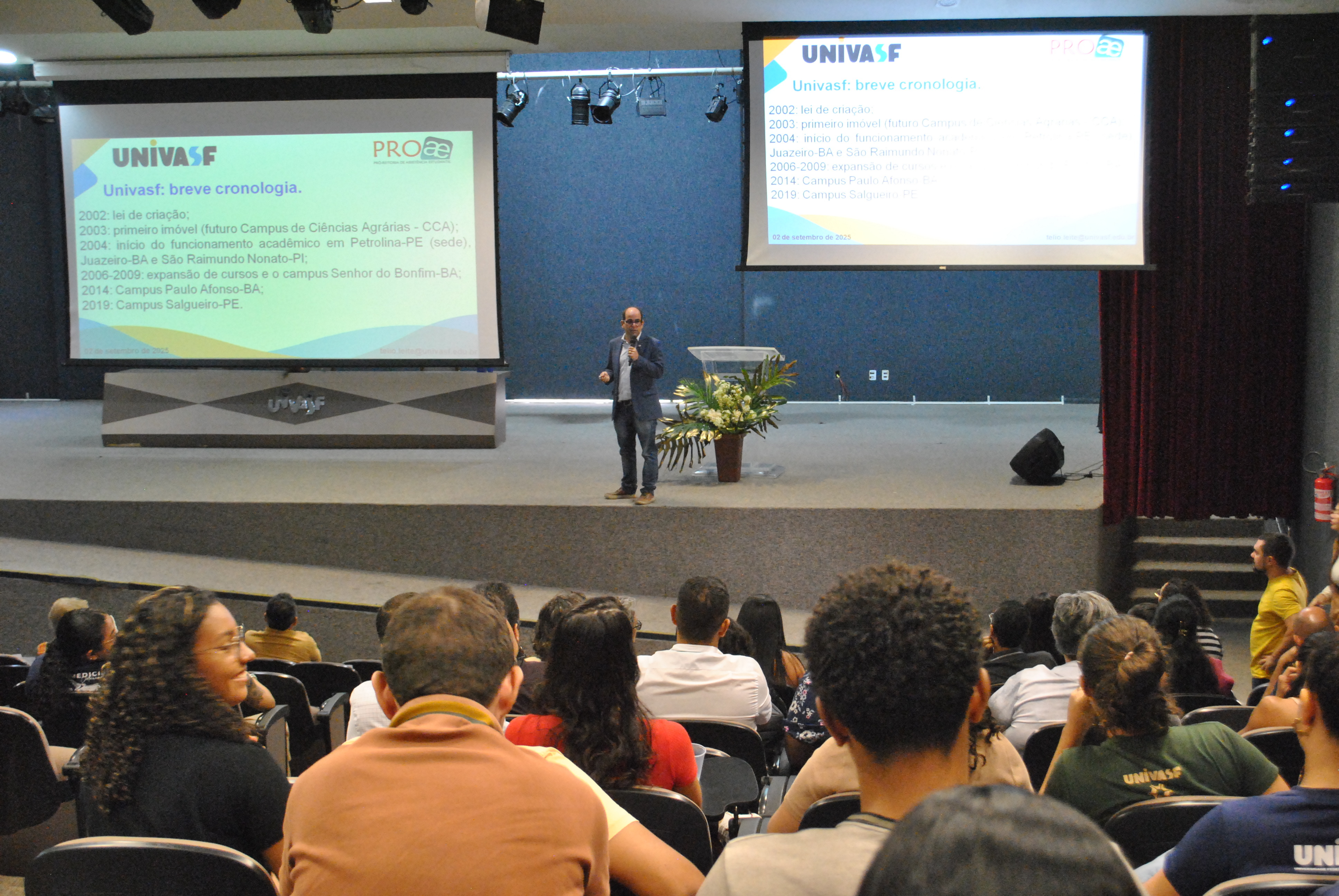 O Evento Temático - 20 Anos de Pioneirismo do Curso de Psicologia reuniu estudantes, docentes, egressos e profissionais da área para celebrar esse marco terça-feira (26). O reitor Telio Leite participou da roda de conversa de abertura do evento e fez um resgate da história do curso de Psicologia, destacando sua importância para toda a região. O evento aconteceu no Cineteatro do Campus Sede, em Petrolina (PE), com a presença do pró-reitor de Ensino, Marcelo Ribeiro; da coordenadora do Colegiado de Psicologia, Barbara Cabral; da professora Mariana Souza, que representou o Centro de Estudos e Práticas em Psicologia (Ceppsi); da professora Marina Gonçalves, que representou o Programa de Pós-Graduação em Psicologia (PPGPSI); da estudante e presidente do CAJU DAPSI, Maria Giovanna Souza Barbosa; da representante do Conselho Regional de Psicologia de Pernambuco - Subsede Sertão do São Francisco (CRP-02), Lucimary Bezerra Serapião; e da professora do CPSI Monica Tomé.