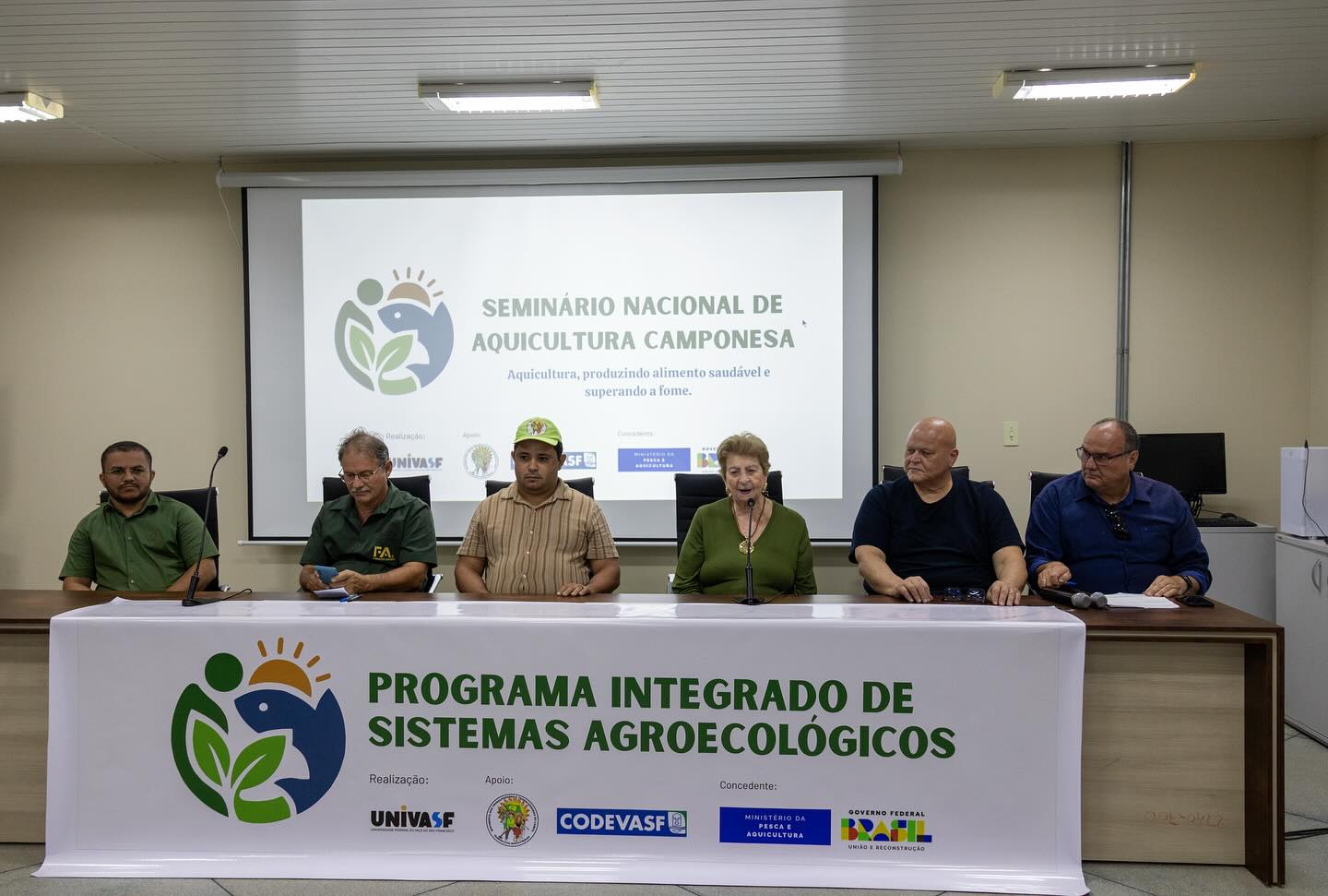 A vice-reitora Lucia Marisy de Oliveira esteve presente na solenidade de abertura do Seminário Nacional de Aquicultura Camponesa, realizado com apoio do Ministério da Pesca e Aquicultura, no Espaço Plural, na noite da quarta-feira (27). O evento aconteceu até a quinta-feira (28) e celebrou o fortalecimento da agricultura familiar e da aquicultura camponesa no semiárido, com a realização de capacitação em aquicultura para agricultores familiares visando à implantação de 20 unidades do Programa Integrado de Sistemas Agroecológicos nos estados de Alagoas e Minas Gerais. A solenidade de abertura reforçou o compromisso com práticas sustentáveis, inclusão produtiva e valorização dos saberes do campo. O evento contou com a participação de agricultores familiares, representantes de movimentos sociais e de professores da Univasf.