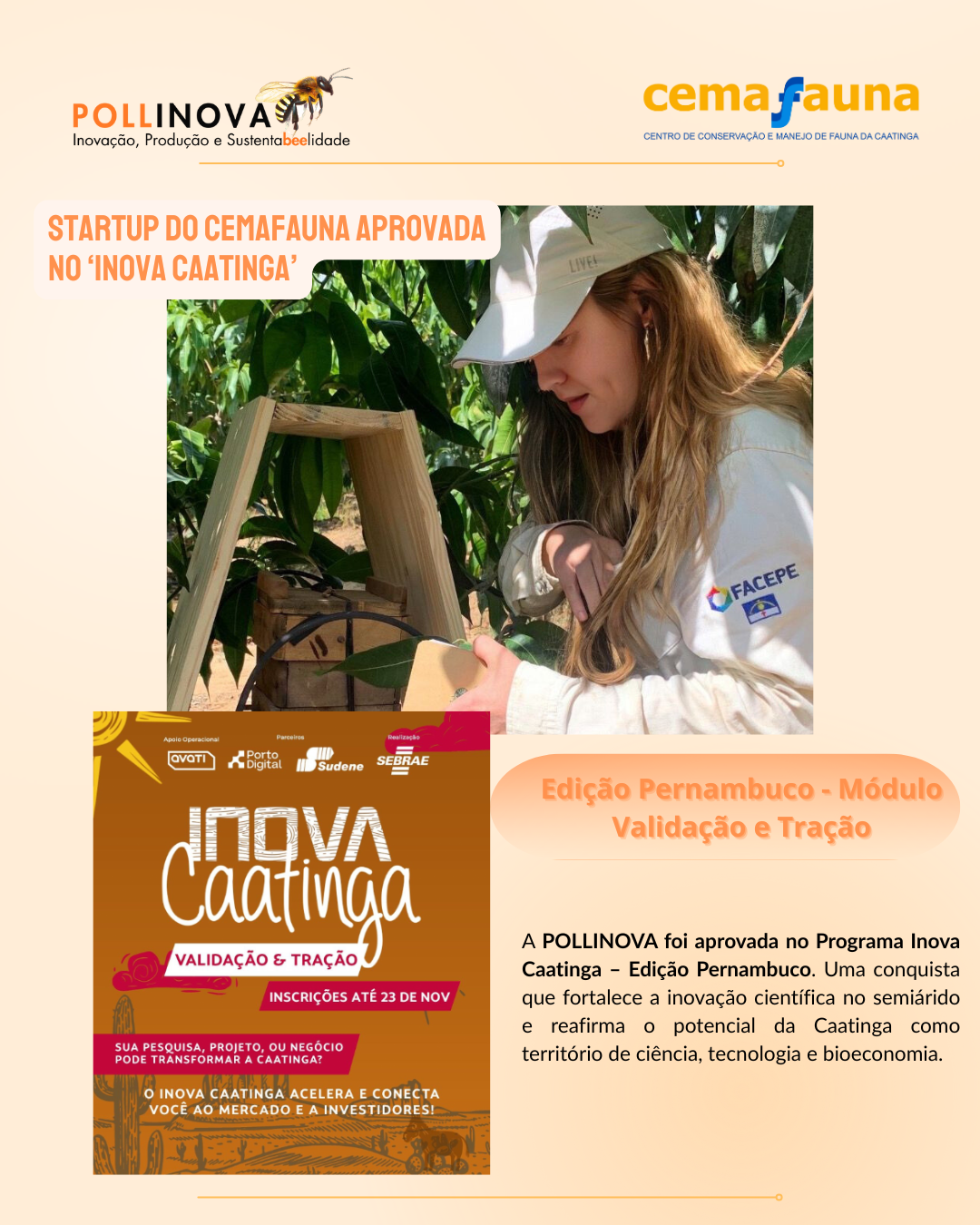 A startup POLLINOVA integra o conjunto de projetos selecionados que se destacaram pelo caráter inovador e pelo impacto positivo no território, reforçando seu papel estratégico na produção de conhecimento e no desenvolvimento de soluções sustentáveis para o semiárido. A startup atua de forma articulada com o Centro de Conservação e Manejo de Fauna da Caatinga (Cemafauna), sediado na Universidade Federal do Vale do São Francisco (Univasf) em Petrolina, Sertão Pernambucano, e tem como foco o estudo, o monitoramento e a valorização dos polinizadores e dos serviços ecossistêmicos associados à biodiversidade da Caatinga.