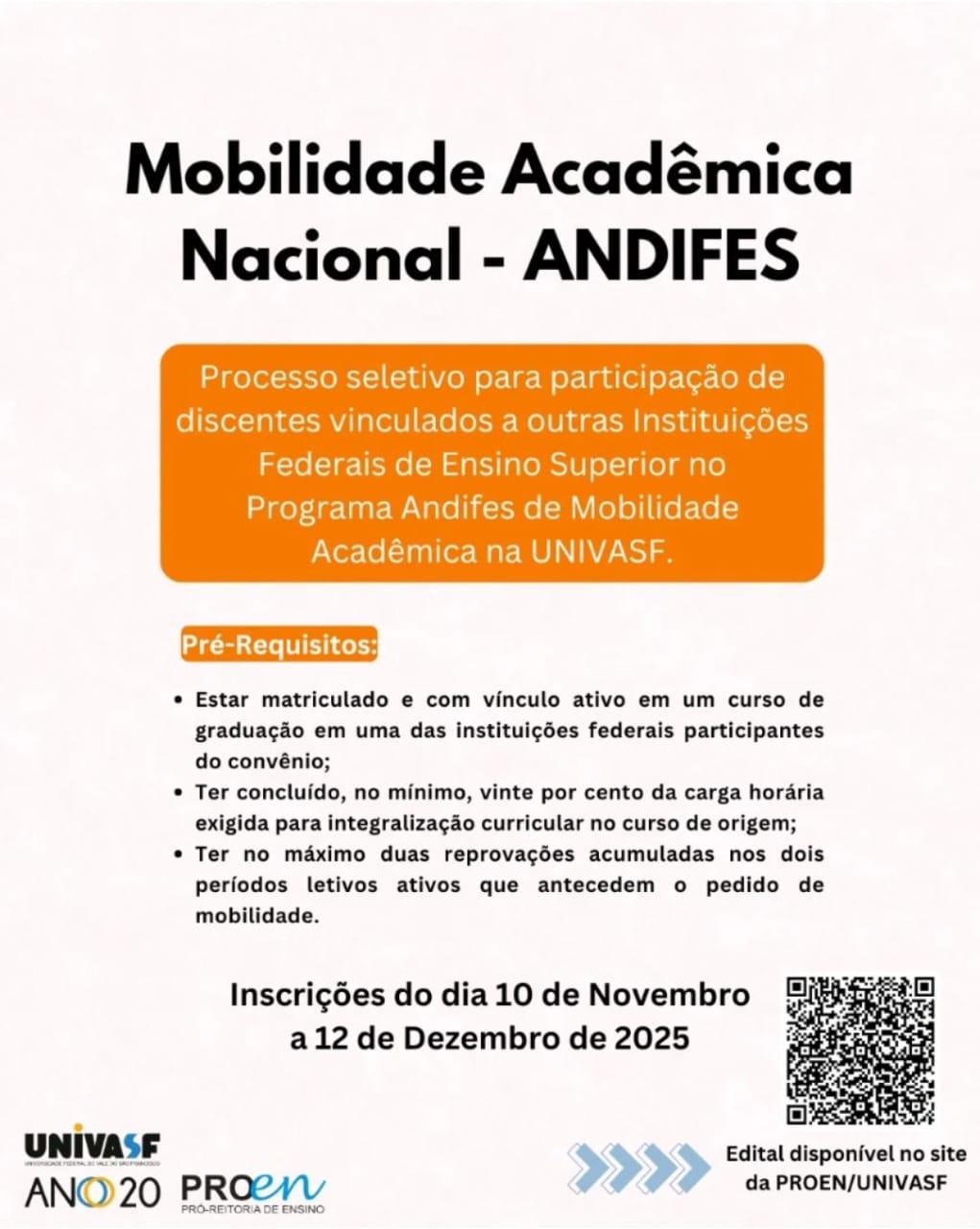 A Universidade Federal do Vale do São Francisco (Univasf), por meio da Pró-Reitoria de Ensino (Proen), lançou o edital de seleção para participação de estudantes de outras Instituições Federais de Ensino Superior (IFES) no Programa Andifes de Mobilidade Acadêmica. Podem participar do processo seletivo discentes de cursos de graduação de instituições conveniadas que tenham interesse em cursar disciplinas na Univasf no período letivo de 2026.1. As inscrições estarão abertas de 10 de novembro a 12 de dezembro de 2025.