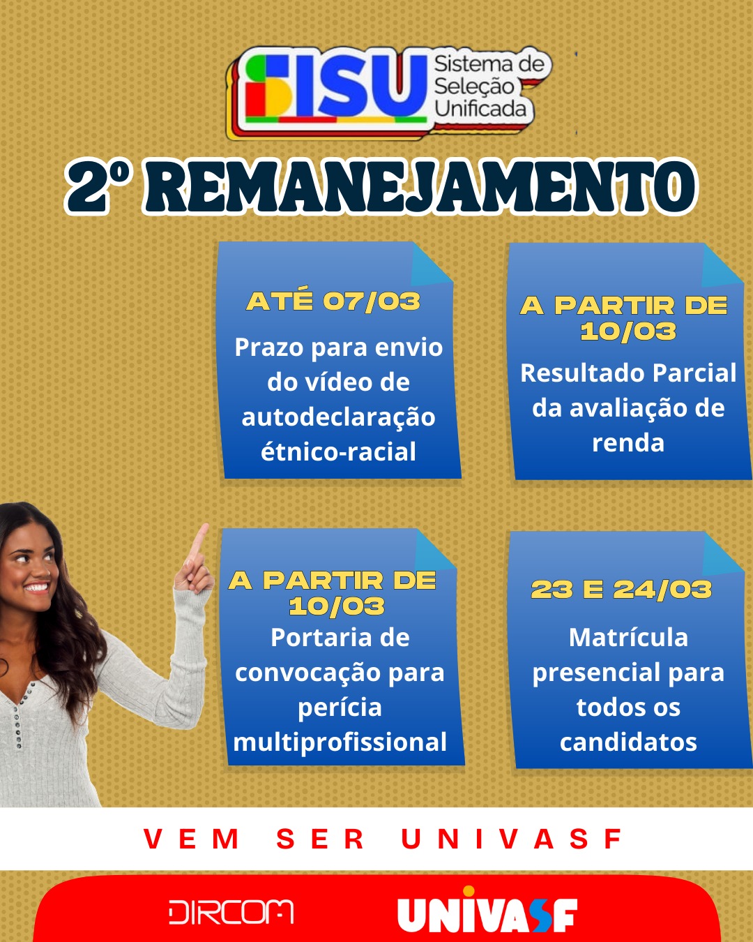 A Universidade Federal do Vale do São Francisco (Univasf), por meio da Comissão Gestora do Processo Seletivo para Ingresso nos Cursos de Graduação Presenciais (PS-ICG) 2026, divulgou na quarta-feira (4) a relação de aprovados no 2º Remanejamento do Sistema de Seleção Unificada (Sisu) 2026. Os candidatos remanejados por meio da Portaria Nº 11/2026 devem ficar atentos ao cronograma do 2º Remanejamento, conforme consta no Anexo 1.