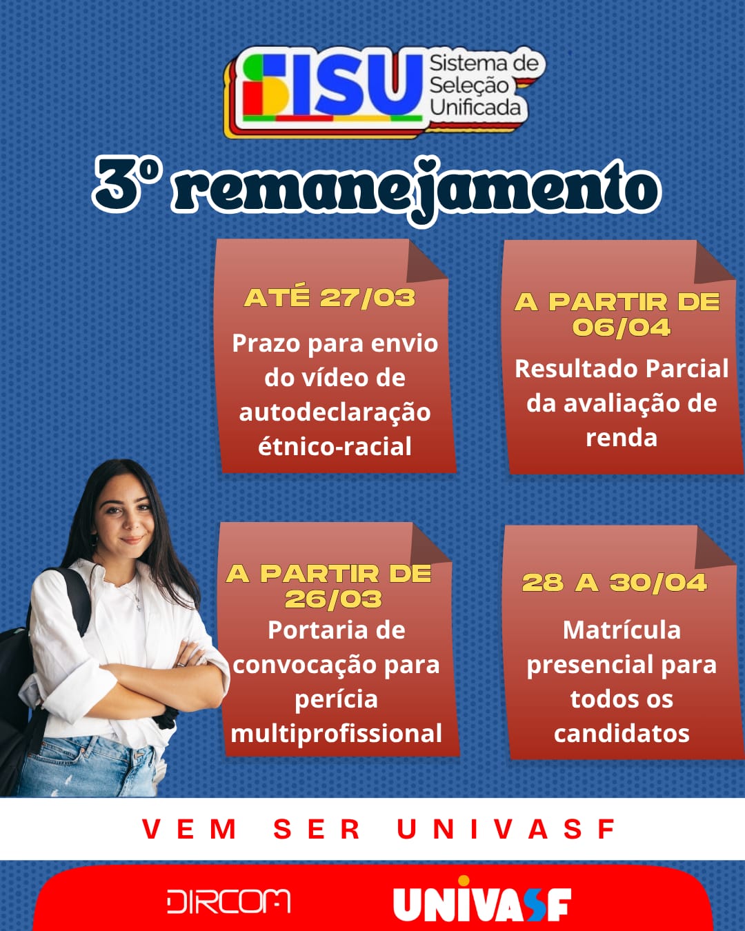 A Universidade Federal do Vale do São Francisco (Univasf), por meio da Comissão Gestora do Processo Seletivo para Ingresso nos Cursos de Graduação Presenciais (PS-ICG 2026), divulgou a lista do 3º remanejamento do Sisu 2026. A convocação contempla candidatos que participaram da Chamada Pública On-line e foram classificados dentro do número de vagas, conforme a modalidade de concorrência, curso e campus. Os candidatos listados tiveram a pré-matrícula confirmada, conforme a Portaria Nº 30/2026.