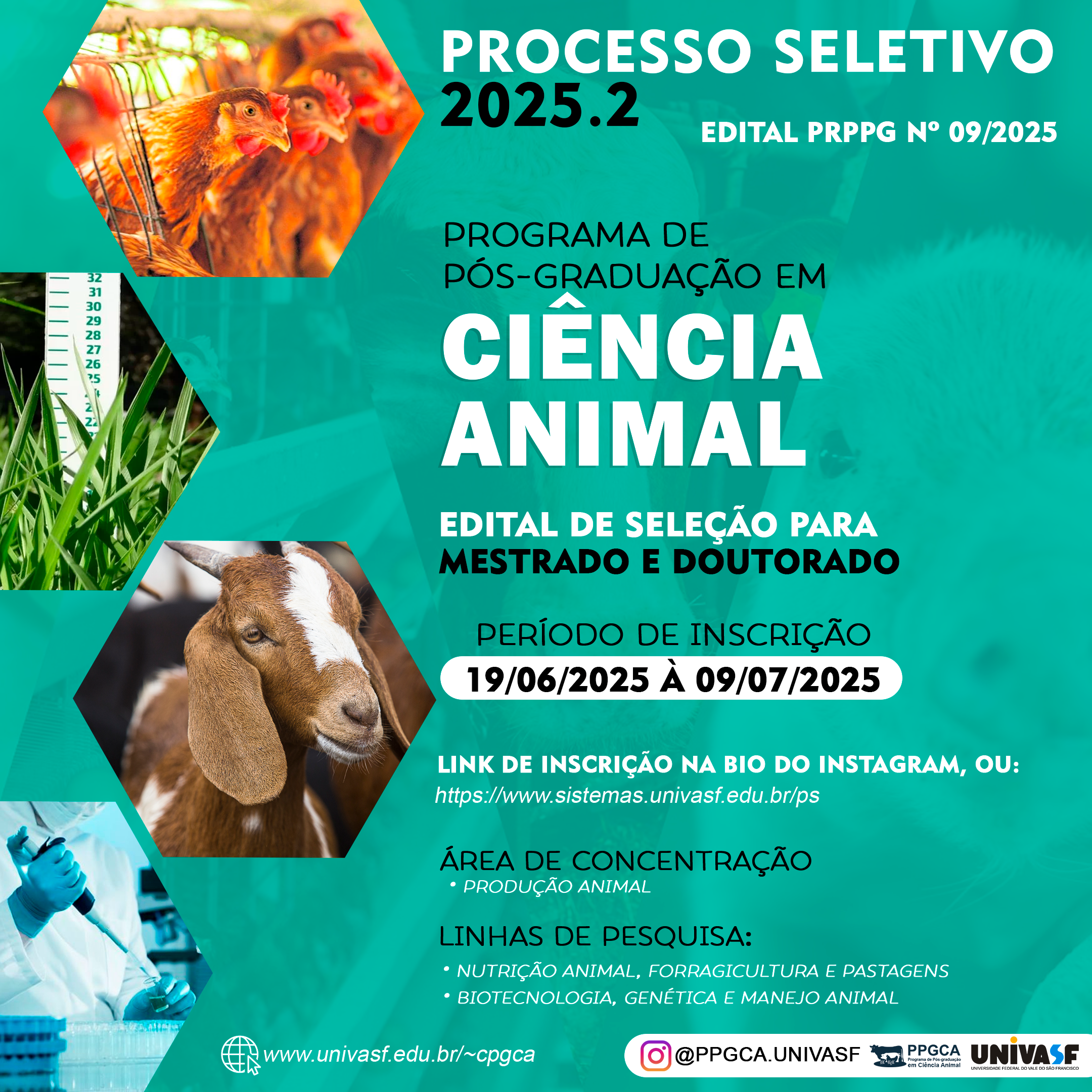 O Programa de Pós-Graduação em Ciência Animal (PPGCA) da Universidade Federal do Vale do São Francisco (Univasf) realiza processo seletivo para mestrado e doutorado acadêmicos com ingresso no período 2025.2. São ofertadas 15 vagas das quais oito vagas para o mestrado e sete para o doutorado, sendo que duas vagas para o mestrado e uma para o doutorado são reservadas para candidatos autodeclarados negros (pretos e pardos), indígenas ou pessoas com deficiência (PCD). Também há reserva de duas vagas para os servidores Técnico-Administrativos em Educação (TAEs) da Univasf. As inscrições podem ser feitas até 9 de julho de 2025.