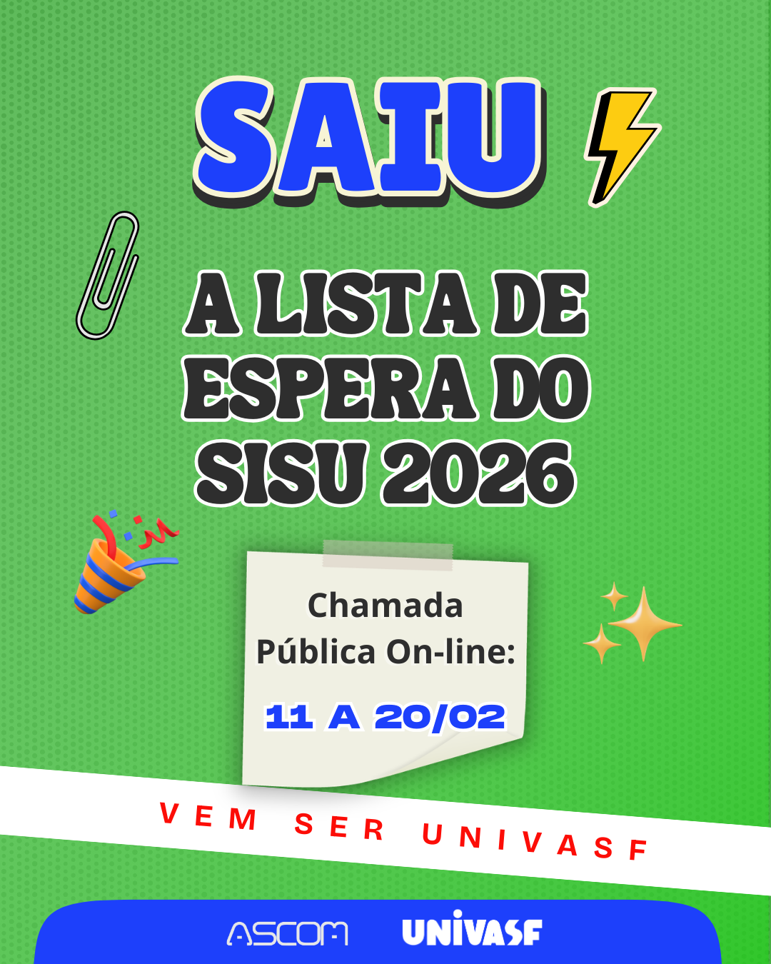 As convocações da lista de espera ocorrerão até o limite de ocupação das vagas remanescentes da chamada regular. A Univasf oferta no Sisu 2026, 1.750 vagas em 33 cursos nos municípios de Petrolina e Salgueiro (PE), Juazeiro, Senhor do Bonfim, Paulo Afonso (BA) e São Raimundo Nonato (PI).