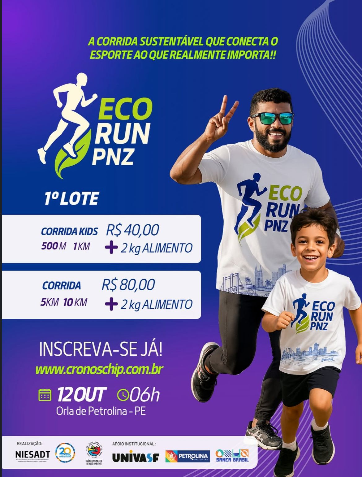 Estão abertas as inscrições para a Eco Run PNZ, corrida promovida pela Universidade Federal do Vale do São Francisco (Univasf), por meio do Núcleo de Inovação em Estudos de Saneamento Ambiental e Desenvolvimento Territorial (NIESADT), em parceria com a Associação dos Servidores da Univasf (Assunivasf). O evento tem como objetivo incentivar a prática esportiva e reforçar o compromisso com a sustentabilidade e o meio ambiente. A corrida será realizada no dia 12 de outubro, às 6h, na Orla de Petrolina, e é aberta ao público.