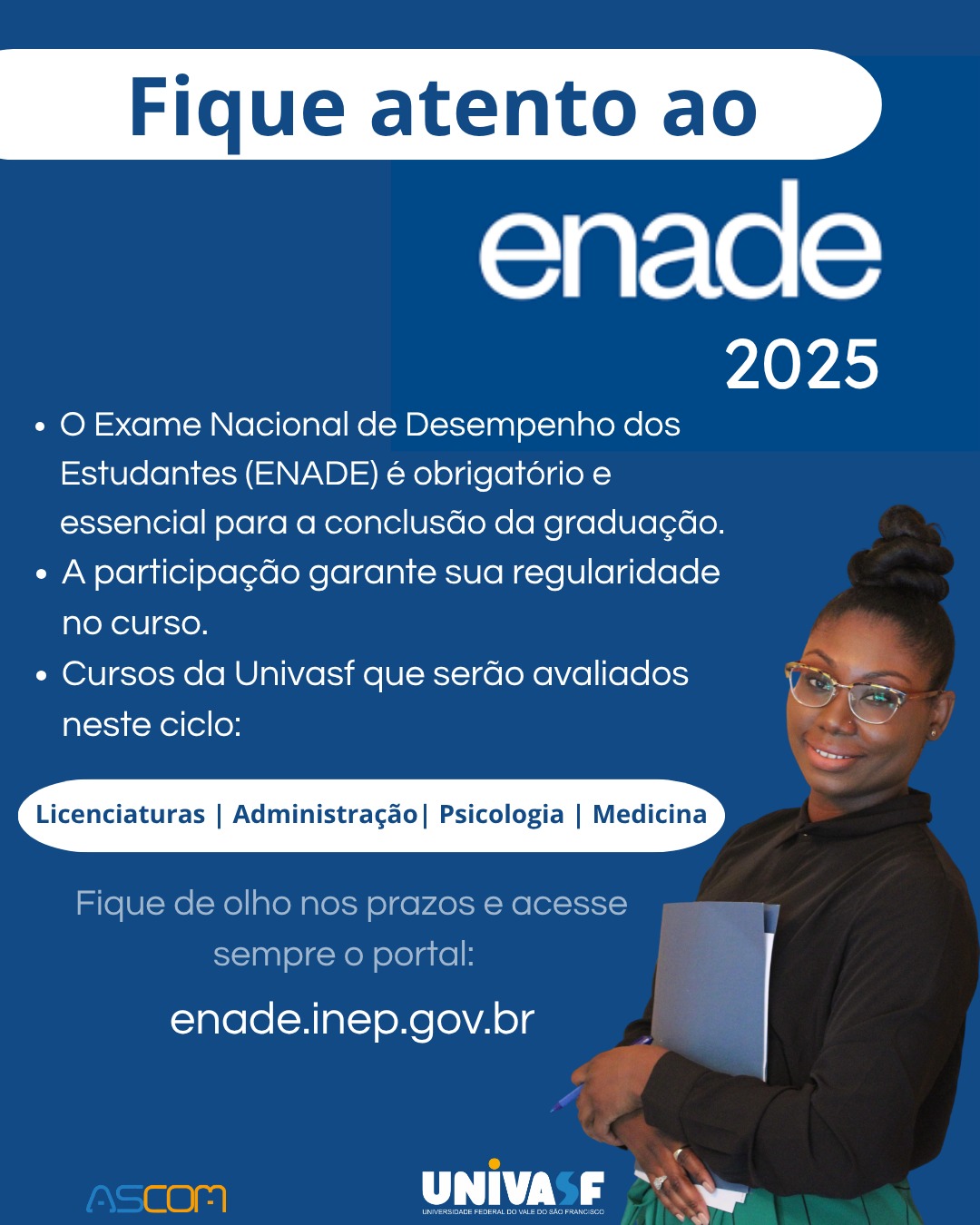 Estudantes de todos os cursos de Licenciatura, exceto Ciências da Natureza, além dos cursos de Administração, Psicologia e Medicina da Universidade Federal do Vale do São Francisco (Univasf), que concluirão a graduação em 2025, deverão participar do Exame Nacional de Desempenho dos Estudantes (Enade). As provas, que serão aplicadas em outubro e novembro, são obrigatórias para os concluintes que tenham cumprido 80% ou mais da carga horária do curso, exceto para aqueles que colarem grau até 31 de agosto, os quais estão dispensados da avaliação.