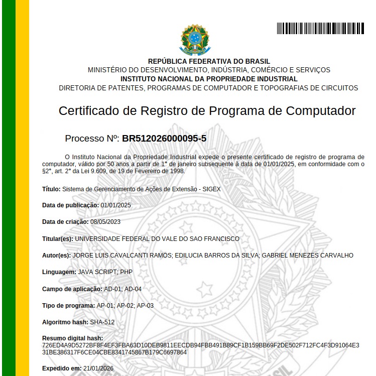 A Universidade Federal do Vale do São Francisco (Univasf) recebeu o certificado de registro de programa de computador, concedido pelo Instituto Nacional da Propriedade Industrial (INPI), para o SIGEX – Sistema de Gerenciamento de Ações de Extensão. A ferramenta, criada para otimizar e digitalizar os processos relacionados às atividades extensionistas da instituição, está em pleno uso na Pró-Reitoria de Extensão (Proex) e torna mais ágil, organizada e eficiente a gestão de projetos e programas voltados à interação da universidade com a sociedade.