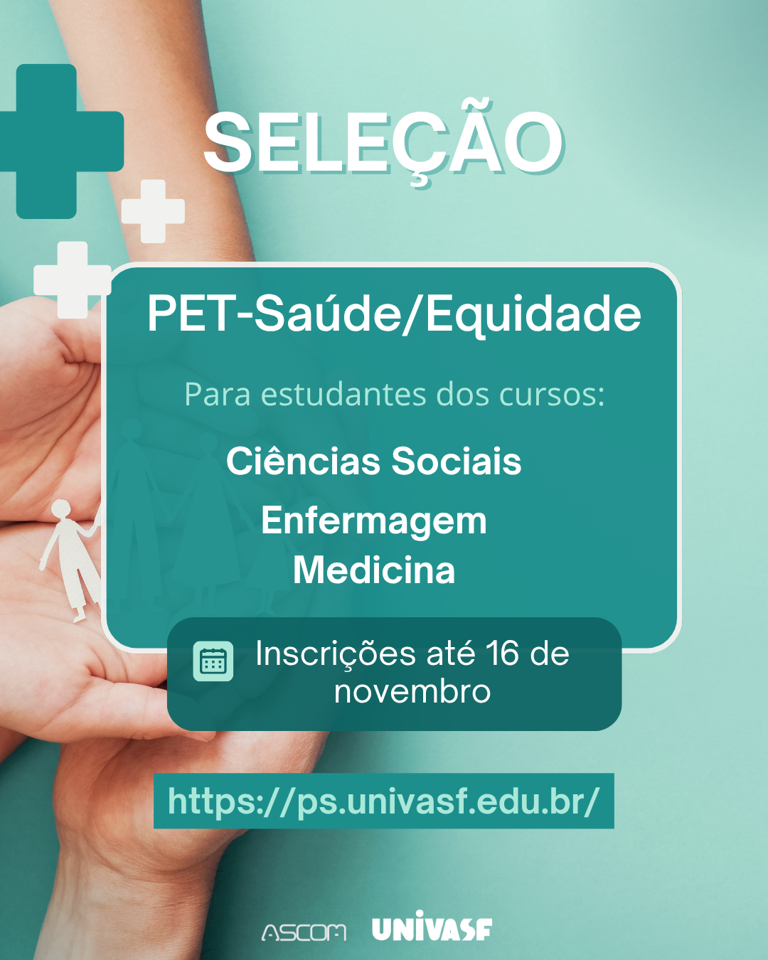 A Universidade Federal do Vale do São Francisco (Univasf), por meio da Pró-Reitoria de Ensino (Proen), está com inscrições abertas para seleção de estudantes bolsistas e voluntários que irão integrar o Programa de Educação pelo Trabalho para a Saúde – Equidade (PET-Saúde/Equidade). Podem se inscrever estudantes regularmente matriculados nos cursos de Ciências Sociais, Medicina e Enfermagem da Univasf, exceto aqueles que estejam cursando o internato ou o estágio supervisionado no período letivo vigente. As inscrições estarão abertas até este domingo (16) e devem ser realizadas exclusivamente pelo Sistema de Processos Seletivos (PS).