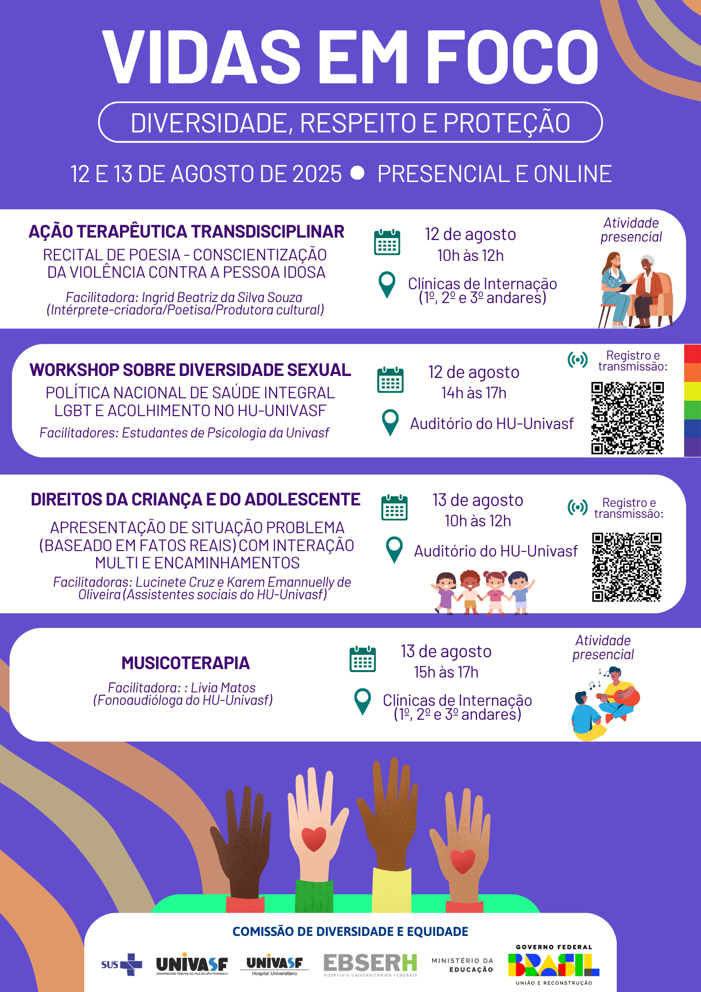 O Hospital Universitário da Universidade Federal do Vale do São Francisco (HU-Univasf/Ebserh) realizará, nos dias 12 e 13 agosto, ações educativas, culturais e terapêuticas com o objetivo de promover a valorização da diversidade, o respeito mútuo e a proteção dos direitos humanos. As atividades fazem parte do projeto "Vidas em Foco: Diversidade, Respeito e Proteção", coordenado pela Comissão de Diversidade e Equidade do HU.