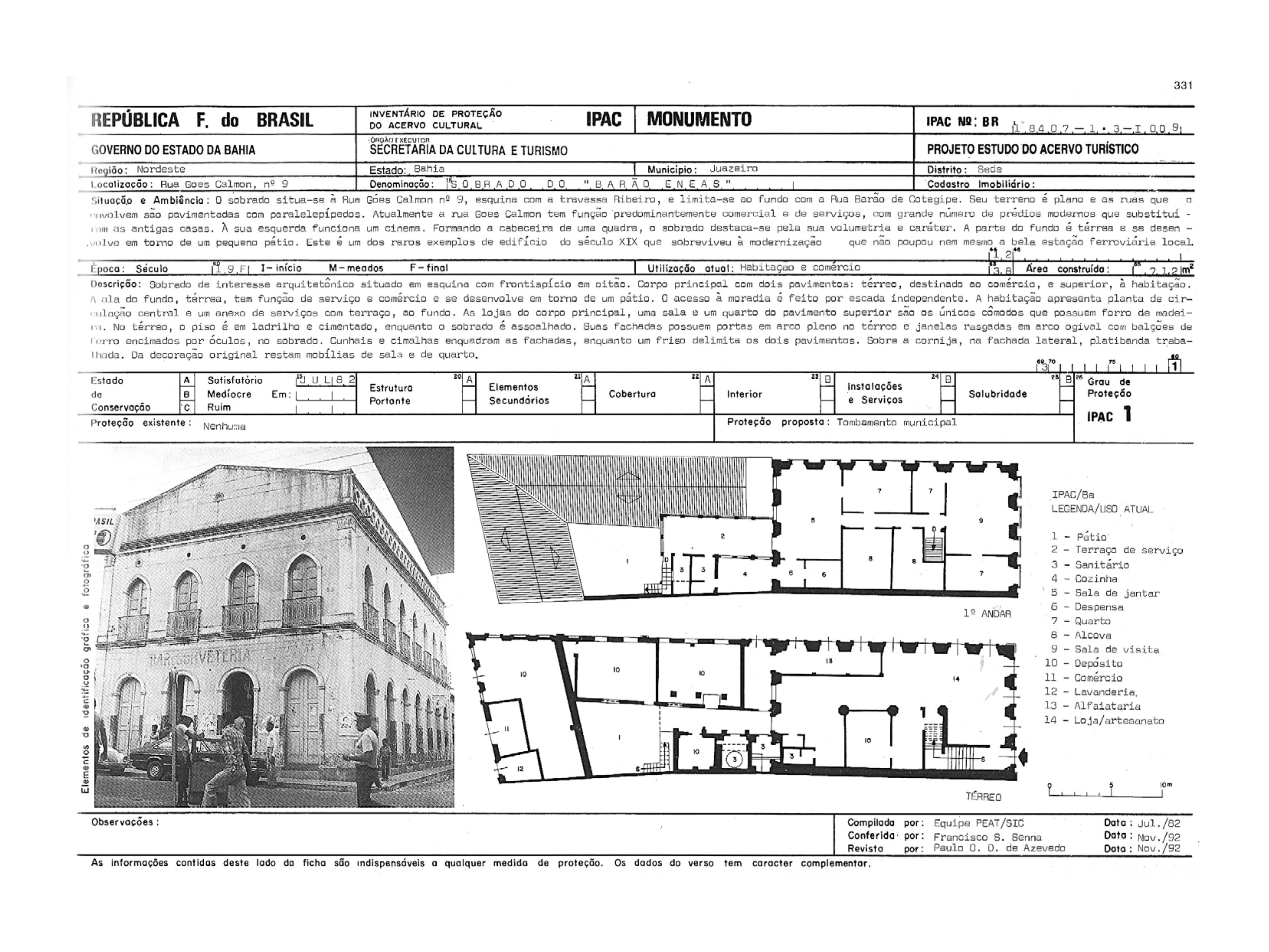 A edificação denominada, à sua época, Sobrado do Barão Éneas é do fim do século XIX. Apresenta estrutura autoportante em tijolo de barro cozido que sustenta o assoalho e a cobertura em duas águas em telha canal com o mesmo material do tijolo. Seus elementos constituintes são de estilo eclético, sendo eles neoclássicos e neogóticos. As suas fachadas frontal e lateral direita apresentam portas do térreo em arco pleno em madeira de cedro, segundo informações de usuários, e portas do pavimento superior em arco ogival com guarda-corpo de ferro, com aberturas circulares acima das janelas, chamadas de óculos. O pavimento térreo, destinado ao comércio, apresenta forro em madeira e o seu piso em ladrilho e cimentado. O pavimento superior, atualmente desativado, é assoalhado e o acesso é feito por escada de madeira, à parte da edificação. Atualmente a parte do térreo tem função comercial. Cunhais e cimalhas enquadram as fachadas, enquanto um friso delimita os dois pavimentos. Na fachada lateral é possível observar ainda a cornija e uma platibanda trabalhada. Encontra-se tombada pelo município, através da Lei N° 1.667/2002.