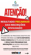 O Programa de Pós-Graduação em Ensino (PPGENS), publicou no dia 09/04/2025 (terça-feira) o resultado preliminar das inscrições para o processo seletivo da turma de 2025.