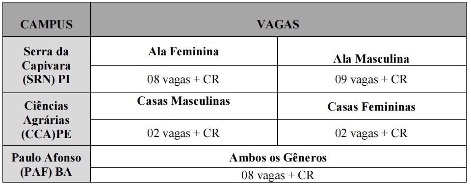 Quadro de distribuição das vagas: