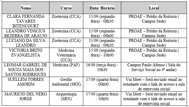 12.09.2025- A PROAE divulga Cronograma de Entrevistas Sociais e demais etapas do Processo Seletivo Simplificado das Residências Estudantis (Edital 02/2025) do Campus Ciências Agrárias, Paulo Afonso e Serra da Capivara.