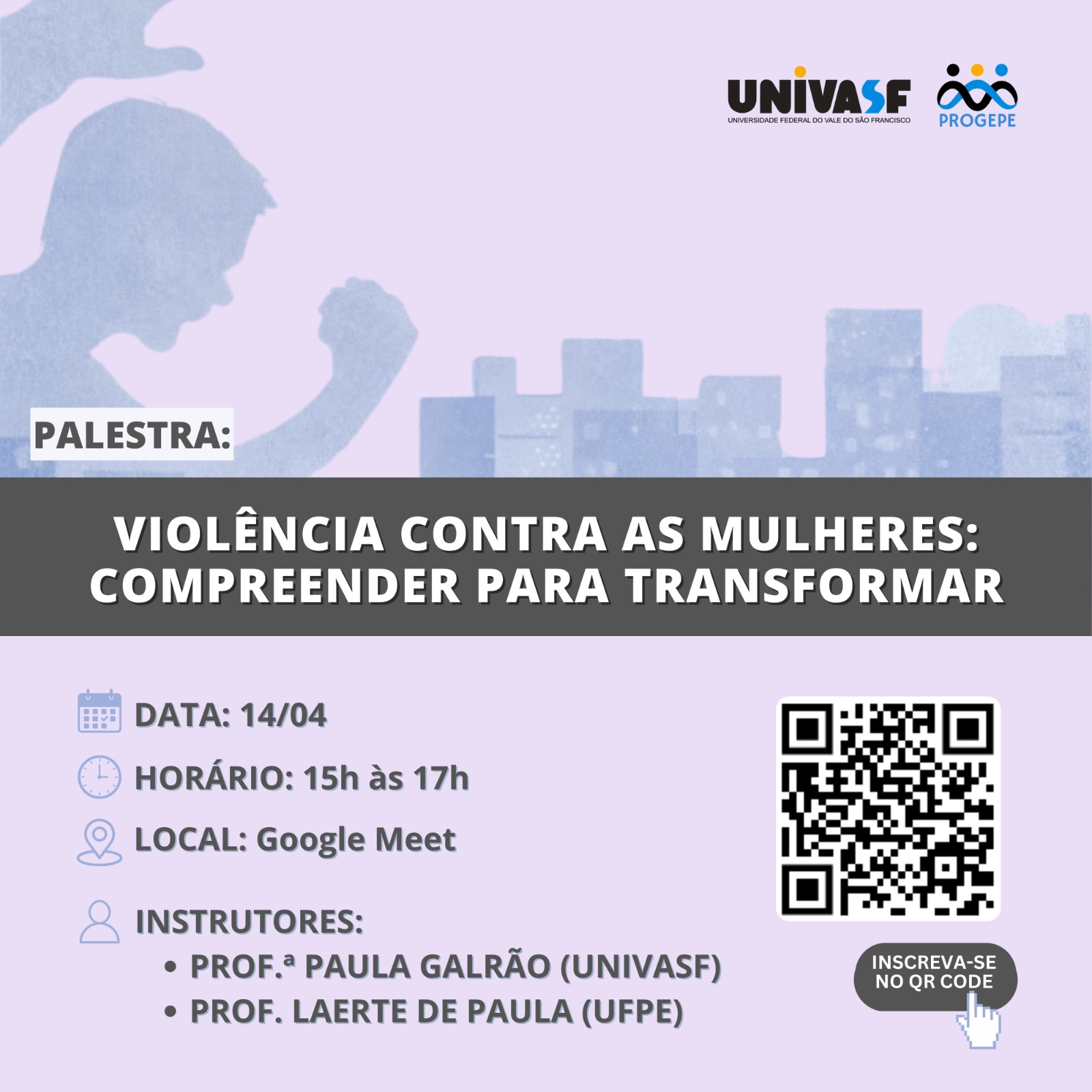 A Pró-Reitoria de Gestão de Pessoas (Progepe), por meio da Diretoria de Desenvolvimento e Qualidade de Vida no Trabalho (DDQVT), da Universidade Federal do Vale do São Francisco (Univasf) promoverá, na próxima terça-feira (14), a palestra “Violência contra as mulheres: compreender para transformar”. A atividade, destinada a servidores e servidoras da Universidade, será realizada das 15h às 17h, por meio do Google Meet.