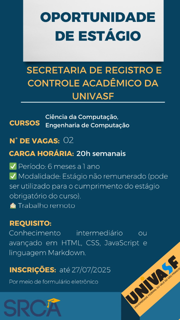 | 16/07/2025 | SRCA abre vaga de estágio em Engenharia de Computação e Ciência da Computação |